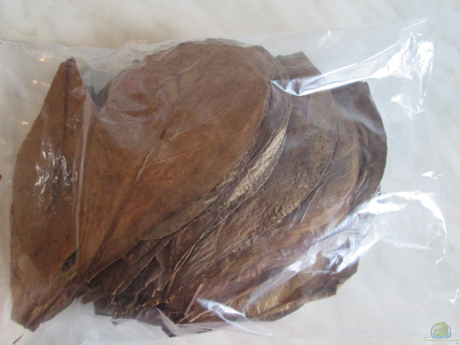 Die Blätter stammen vom Katappenbaum (Terminalia catappa), der umgangssprachlich als Seemandelbaum bekannt ist. Dieser bis zu 25m hohe Baum kommt im Westpazifik und auf der malesischen Inselgruppe vor. Die fast olivgrünen Blätter von Terminalica Katappa werden bis zu 30 cm lang und haben eine gewisse ??hnlichkeit mit Lorbeerblättern. Julius Cäsar hätte seine Freude daran gehabt.