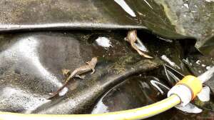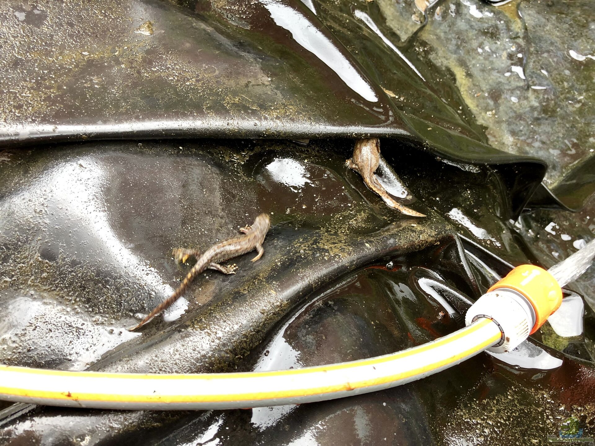Das Biotop wird auch niemals ganz ausgelassen, damit noch genügend Mikroorganismen übrigbleiben und der Teich nicht kippen kann. Wenn dann ca.80-90% des Wassers ausgelassen wurden, kommt die Pumpe wieder aus dem Teich und ich beginne mit einem Schlauch die verbliebenen Blätter in die übriggebliebene Wasserpfütze zu spritzen. Anschlie??end werden mit einem Netz die Blätter und etwas vom Schlamm herausgeholt und in der Nähe des Teichs aufgebreitet, um etwaige Molche, Libellenlarven und Rückenschwimmer einzusammeln. Die aus Versehen gefangenen Tiere kommen vorrübergehend in Wassergefüllte Gefä??e, um sie so schnell als möglich wieder in den Teich zurück zu lassen??? Dies dauert meist 30-45min ??? wir versuchen uns dabei immer sehr zu beeilen, damit die Tiere so kurz als möglich dem Stress ausgesetzt werden. Meine Mutter ist mir da immer eine gro??e Hilfe.