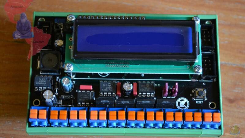 Die Platine des Eiwomisa v2.0 hat eine Grösse von 113x73mm, Sie ist in ein Hutschienengehäuse verbaut. Zusammen mit einer KSQ-Erweiterung beträgt die Grösse dann 169x73mm, es können aber auch noch weitere Platinen angesteckt werden. Dazu wird dann auch immer das Hutschienengehäuse erweitert. Den Eiwomisa V2.0 gibt es zur Zeit nur mit einem blauen 2-zeiligen LCD-Display, er besitzt allerdings kein eigenes Tastenfeld mehr, zur Bedienung wird also eine Fernbedienung (optional, ab Logitech Harmony 200) benötigt, wer auf Taster steht kann aber auch über die Federklemmen ein Tasterfeld mit 6 Tasten anschliessen, andere Erweiterungen sind in Planung.