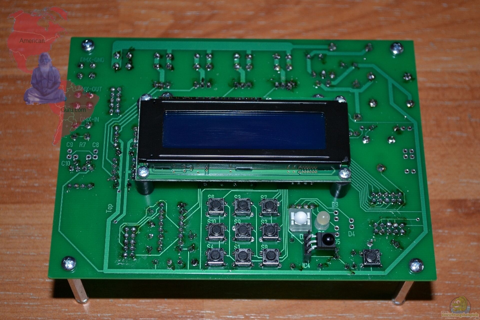 Bild3: Die Oberseite mit dem zweizeiligen LCD-Display, hier in Blau, welches aber auch in Gelb erhältlich ist. Ausserdem befinden sich dort 9 Minitaster, der IR-Sensor und 2 Kontroll-LEDs.