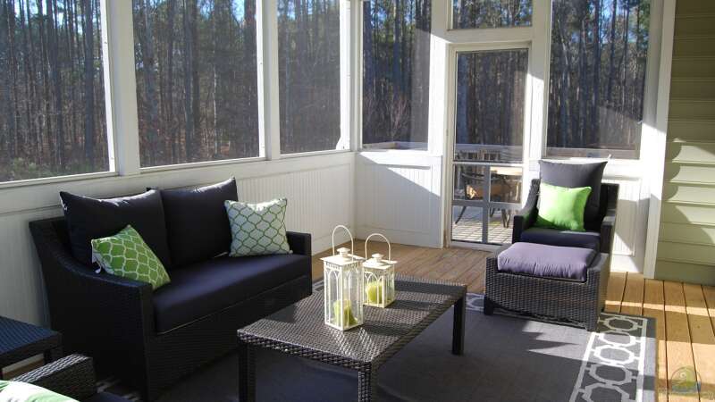 Dekorative Elemente wie Kissen, Decken und Teppiche in natürlichen Farben und Materialien schaffen eine gemütliche Atmosphäre. Laternen, Kerzen und Lichterketten sorgen für stimmungsvolle Beleuchtung und machen den Übergang auch bei Dunkelheit einladend.