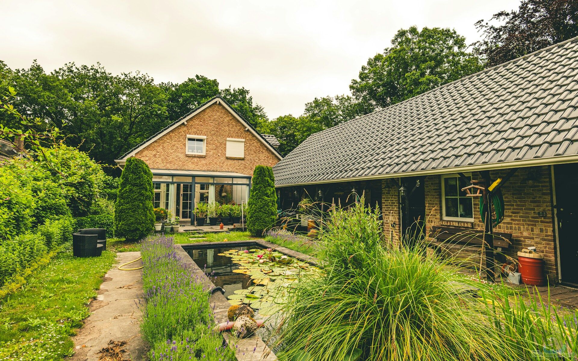 Skulpturen rund um den Teich, eine Sitzgelegenheit für gemeinsame Stunden mit Ihren Liebsten oder einige Pflanz- und Blumentöpfe machen den Bereich zu einem idealen Treffpunkt für gesellige Runden mit Freunden und Familie.