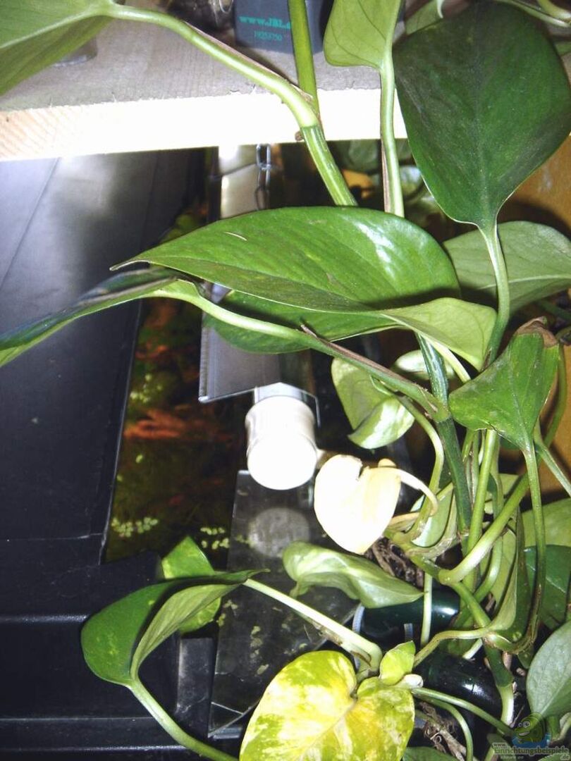 Die hintere Leuchtstofflampe hängt über dem offenen Bereich und es sind die Luftwurzeln von Efeututen-Zimmerpflanzen in das Becken gehängt. Die Efeututen ranken über dem Becken raus und schlängeln sich über die Abdeckung und das Regalbrett welches darüber hängt.
