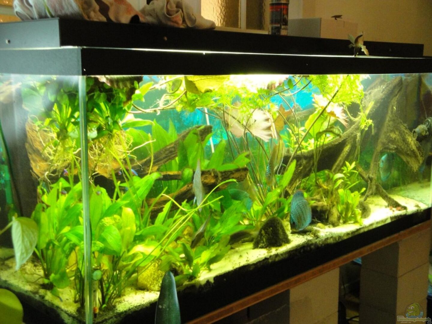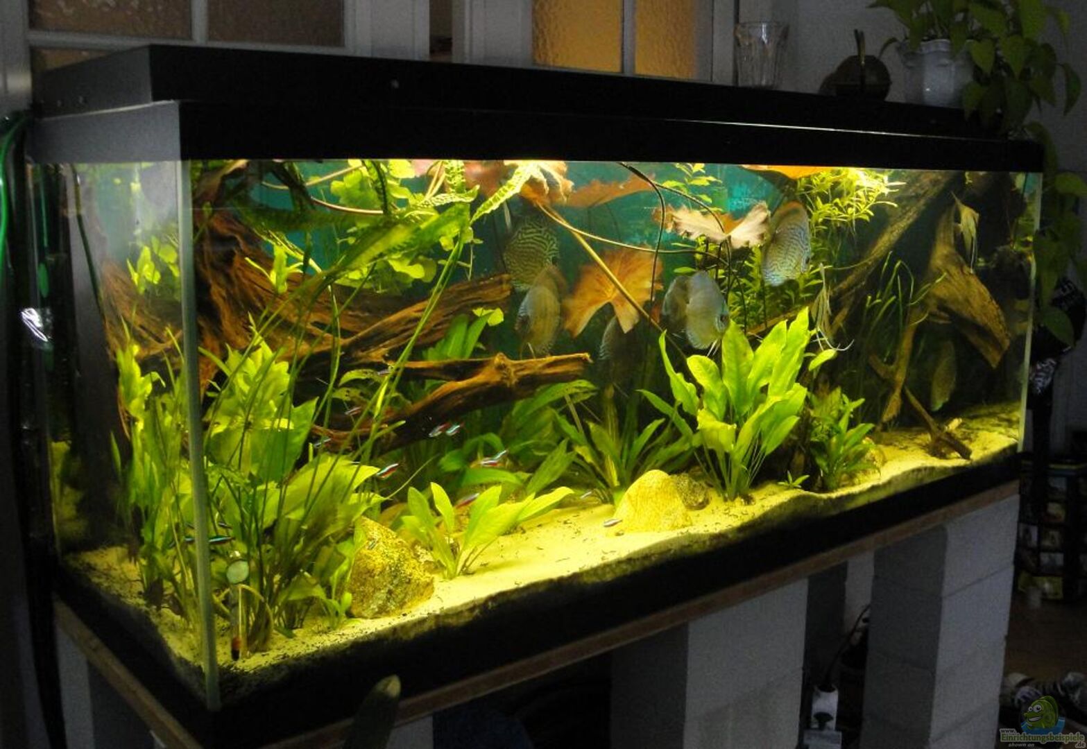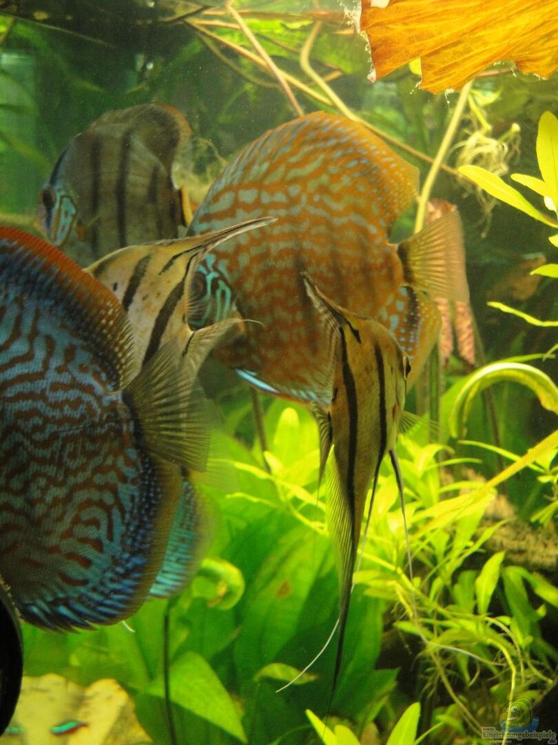 14.04.09: der kleinste Diskus ist mir leider verstorben =`(, einen Skalar habe ich abgegeben, weil dieser plötzlich aggressiv gegenüber allen anderen Fischen wurde. die Pflanzen habe ich zurückgeschnitten, einige sind mir leider auch eingegangen...die Wurzel wurde nun auf die rechte Seite verschoben und die Disken erkunden neugierig ihre ´neue´ alte Wurzel =) eine 3 Neonröhre habe ich ergänzt