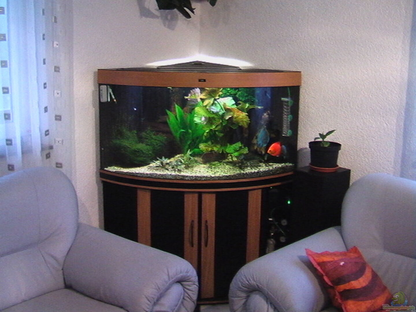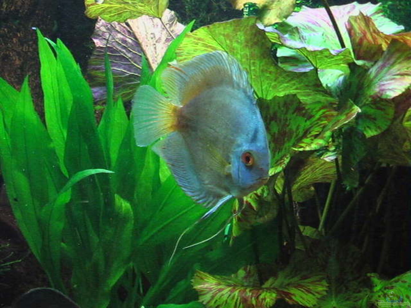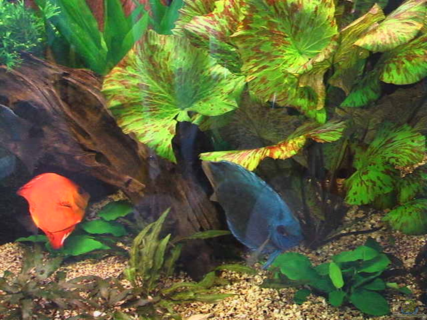 Ein schönes Becken mit schönen Fischen und Pflanzen. Hier noch ein paar Verbesserungsvorschläge: Den hässlichen Blasenzähler nach hinten und hinter Pflanzen verstecken, Diskus und Prachtschmerlen fühlen sich mit Sandboden wohler und die Prachtschmerlen sind Rudeltiere, die ab mindestens 5 Tieren gehalten werden sollten. Da Dein Becken aber für Tiere, die fast 30cm gross werden, zu klein ist, solltest Du sie lieber abgeben.