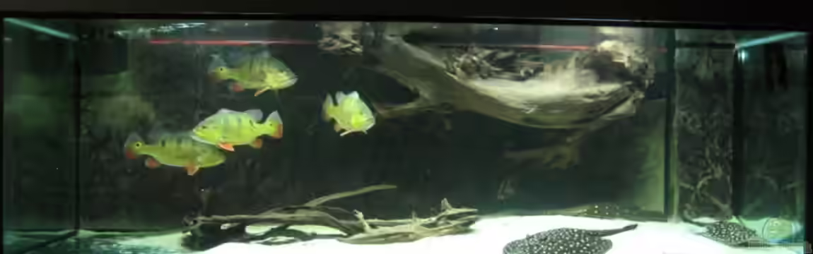 Der Besatz hat sich etwas geändert, da die Rochen mit zunehmender Grö??e ihre Beifische als Futter betrachtet haben. Aufgrunddessen sind 4 ausreichend gro??e Cichlas eingezogen, die nicht mehr ins Beuteschema passt. Die Beleuchtung wurde von 2 x 58 W T8 auf 2 x 39 W T5 umgestellt.