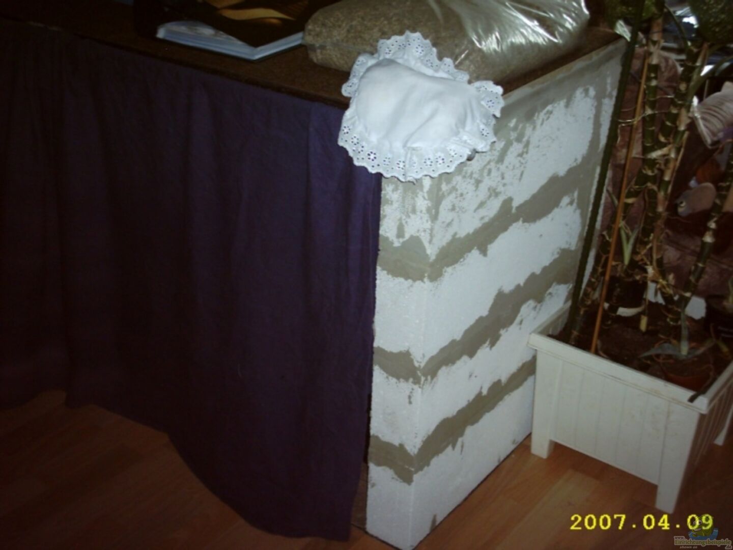 untergestell ist selber aus gasbetongsteinen gebaut mit einer 8fachgeleimtem hosplatte das becken ist als raumteiler und damit freistehend von 3 seiten zubeobachten die 4 seite ist mit styropor verkleidet oberfläsche habe ich mit glasscheiben abgedeckt , da es erst offen war hatte ich zuviel wasserverdunstung