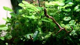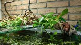 Aussenbepflanzung, Wasserpflanzen mit den Wurzeln im Wasser stehend: Echinodorus bleheri, Lilaeopsis novae zelandiae, Hydrocotyle verticillata, Spatiphyllum wallisii, sowie Teichlebermoos