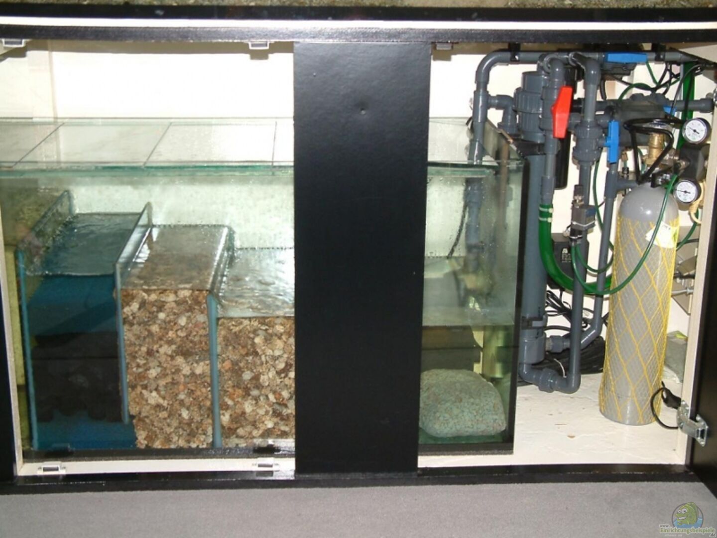 Als Förderpume Eheim 1260, 2400 l/h, wird durch Bypässe und Absperrhähne gedrosselt.