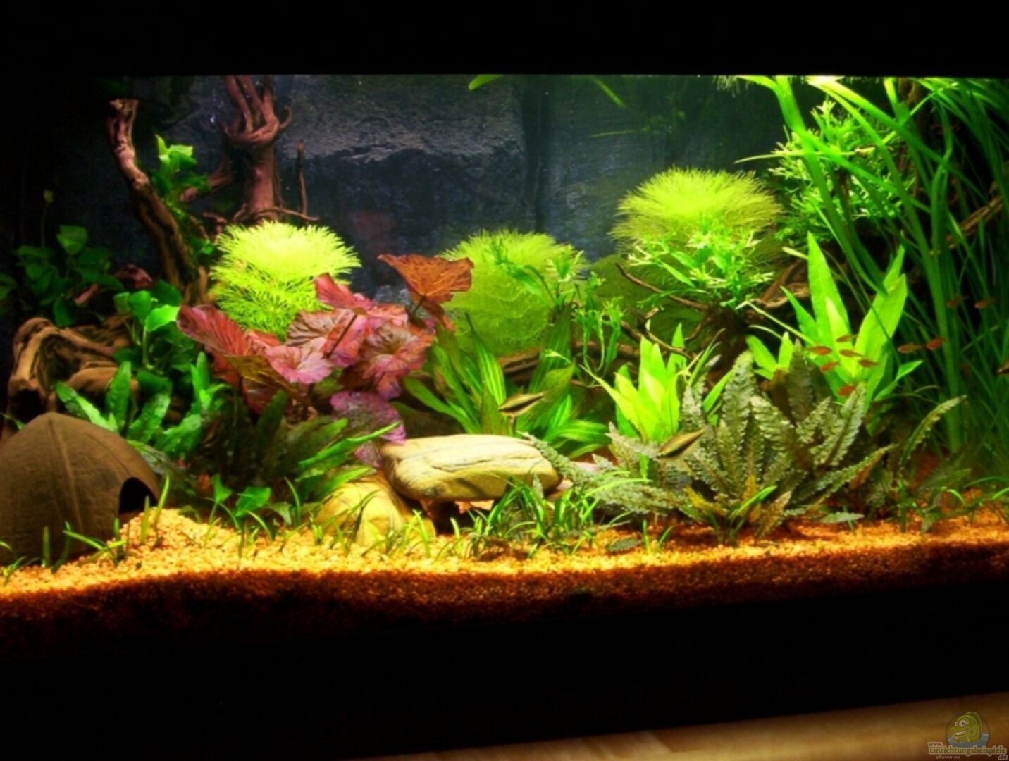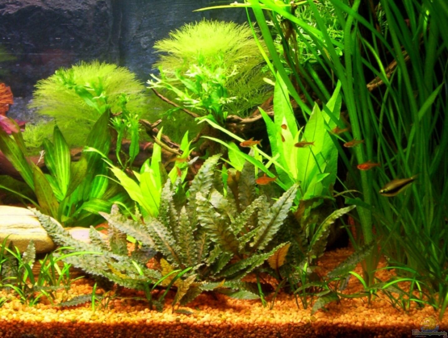 Da ich im April 05 erst wieder angefangen habe (zuletzt vor 20 Jahren so ziemlich alles falsch gemacht), wurde nach langer Lektürezeit bewu??t ein einfach aufgebautes Standardbecken gewählt.Grö??ere Rückschläge sollten dabei hauptsächlich vermieden werden. (Platzbedingt wäre auch vorerst kein grö??eres möglich gewesen). Einfache Pflanzen, Bodengrund und Bodenheizung sorgen für einen guten Pflanzenwuchs. Einzig die Echinodorus in Beckenmitte und die Gräser im Vordergrund wollen noch nicht so richtig. Hoffe, dass ich das ganze mit CO2 nun hoch bringe. Die Molive-Barsche bekommen in Abständen von 4-6 Wochen Nachwuchs, von denen bisher aber nur 7 Stück (dann in einen anderen Becken) gro?? gezogen werden konnten.