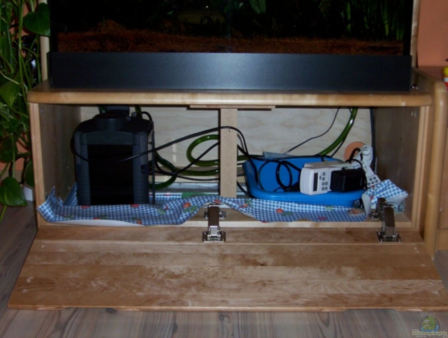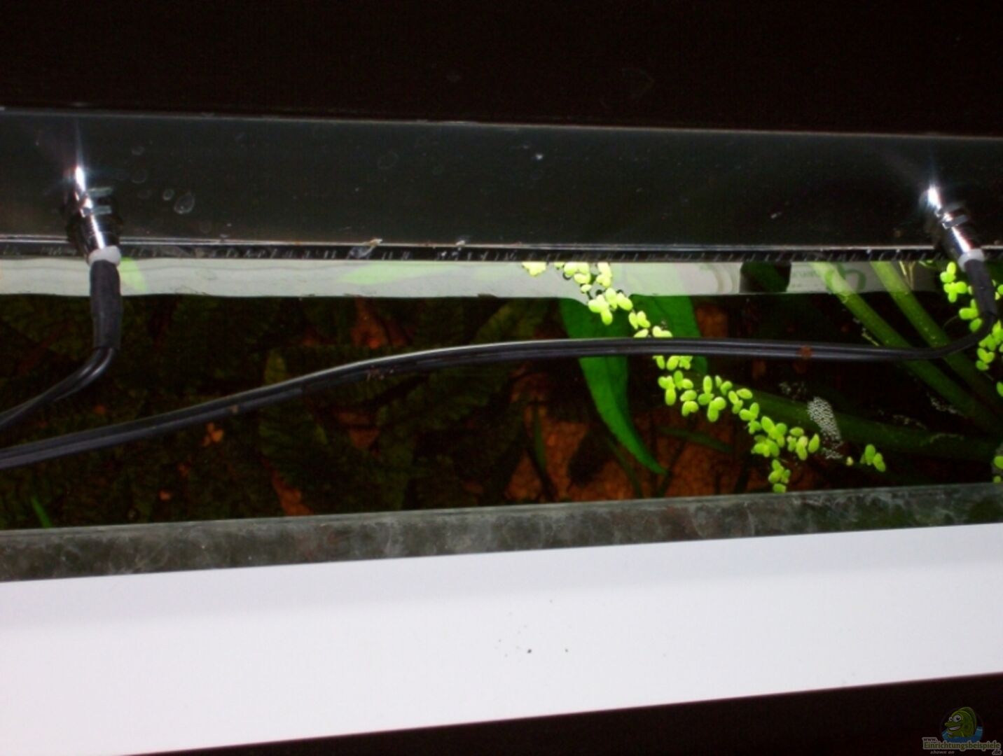 Bodenheizung zur ´Bodendurchlüftung´ 10W. Läuft im Winter ständig, im Sommer gemeinsam mit Beleuchtung geschaltet. Dazu 50W-Heizer, der nur im Winter selten einschalten muss. CO2-Anlage mit Magnetventil zur Nachtabschaltung. Läuft mit 6 Blasen/ Min. unterstützend. Ich hoffe, die Echinodorus in der Beckenmitte wird es mir danken...