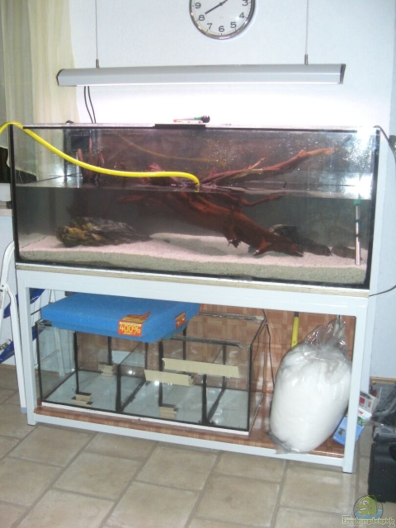 Ein Selbstgebautes 160 Liter Filterbecken mit 5 Kammern. 1.Kammer ein Fischernetzerl ganz fein für groben Schmutz dann eine Filterwatte ein 2cm grober Filterschwamm und ein 5 cm dicker grober Filterschwamm. 2. Kammer ein 5cm grober Filterschwamm iund eine 20 cm schicht doppelt gebrannter Lekka. 3. Kammer 20 cm Lekka und ein 5 cm grober Filterschwamm. 4. Kammer 20 cm Lekka und ein feiner Filterschwamm. 5. Kammer ein feiner Filterschwamm auf dem steht eine regelbare heim Pumpe mit einer Leistung von 1000 -2000 Liter in der Stunde.