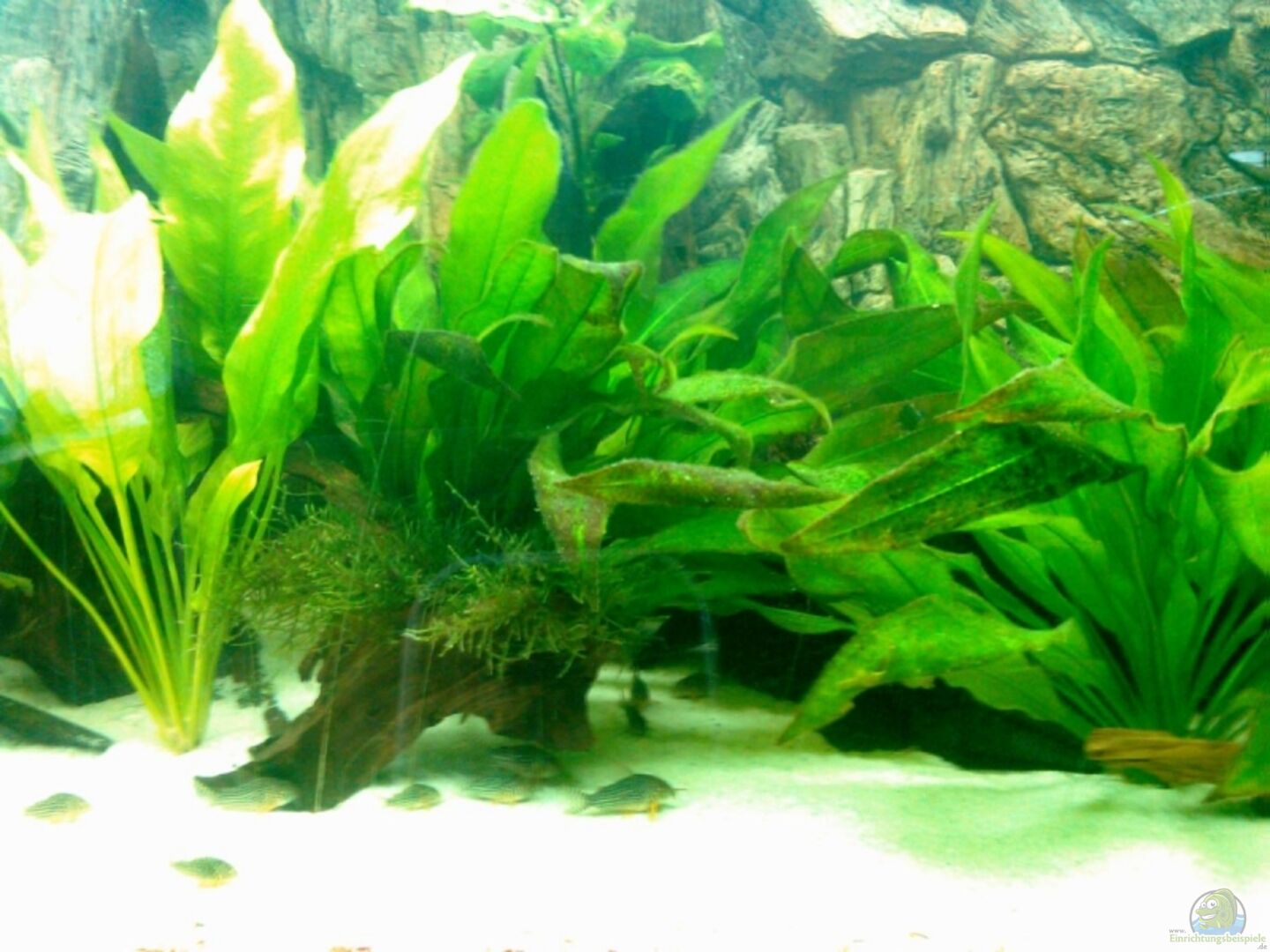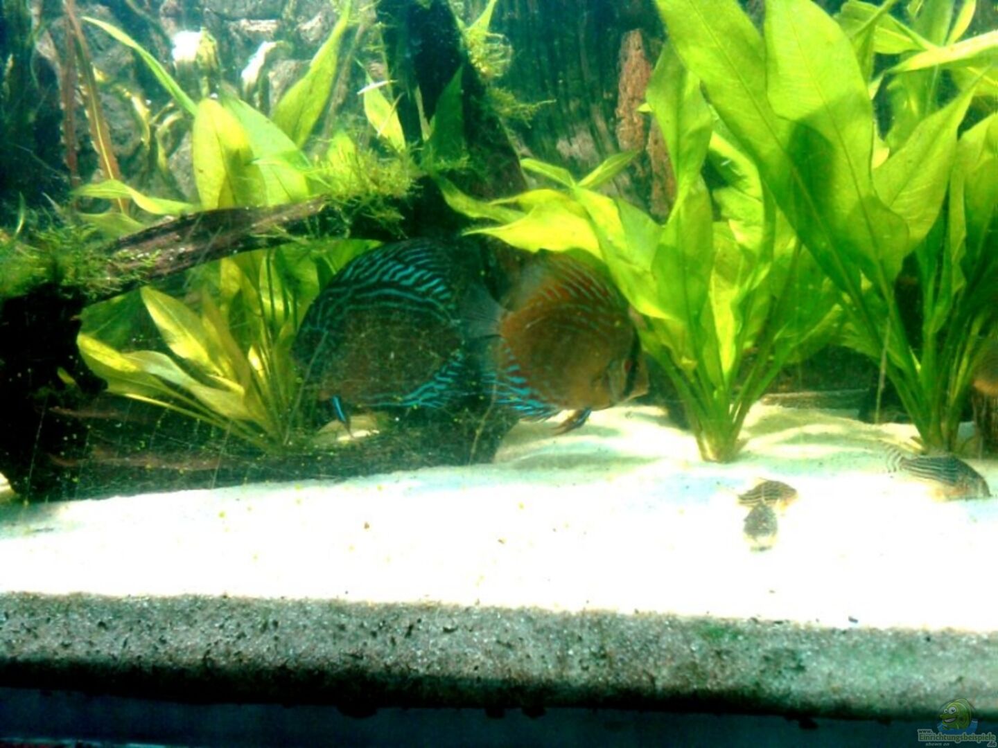 16.08.2008 Bodengrund auf 100% Quarzsand umgestellt. 3 der älteren Sterbais haben die Umstellung leider nicht überlebt. War wohl doch zuviel Stress. Sie sind eine Woche nach dem umstellen auf Sand direkt nach dem Ww einer nach dem anderen aufgebläht und in der Nacht verstorben. Einer Montag der nächste am Mittwoch und der letze am Donnerstag. Das Sterben hat Gottseidank aufgehört und die Disken inclusive der Neuzugänge zeigten keinerlei Symtome. Die Jungen Corys entwickeln sich dafür aber prima sind 6 an der Zahl und haben jetzt ca 2 bis 2, 5cm. Neue Beleuchtung gekauft (war nicht so ganz billig). Tunze Nano hinter der Rückwand installiert. Die Oberflächenabsaugung ist echt der Hit. Disken sind mitlerweile echt riesig geworden. Der kleinste Rt, der schon in seiner Jugend immer wieder durch Nahrungsverweigerung auffiel hat es leider nicht geschafft. Er starb ende Mai, war 3 cm kleiner als die anderen und verweigerte mal wieder jedwege Nahrungsaufname. Quarantäne + Temperaturerhöhung auf 34°C was bislang immer half, zeigte dieses Mal keine Wirkung. Das ist das Risiko wenn man sich Babydisken kauft um sie selbst gro??zuziehen. Ich war bei meinem Lieblingshändler und der hatte noch zwei sü??e niedliche 6, 5 cm gro??e Rt´s da, ich konnte nicht wiederstehen und den kleinen gehts super. Ich hatte sie nach nur 30 min. im Quarantänebecken an Futter. Mittlerweile schwimmen sie mit den Gro??en und entwickeln sich prima. Im Bereich Dekoration und Pflanzen ist in letzter Zeit mehr passiert. Deshab habe ich alle Fotos durch aktuelle ersetzt.