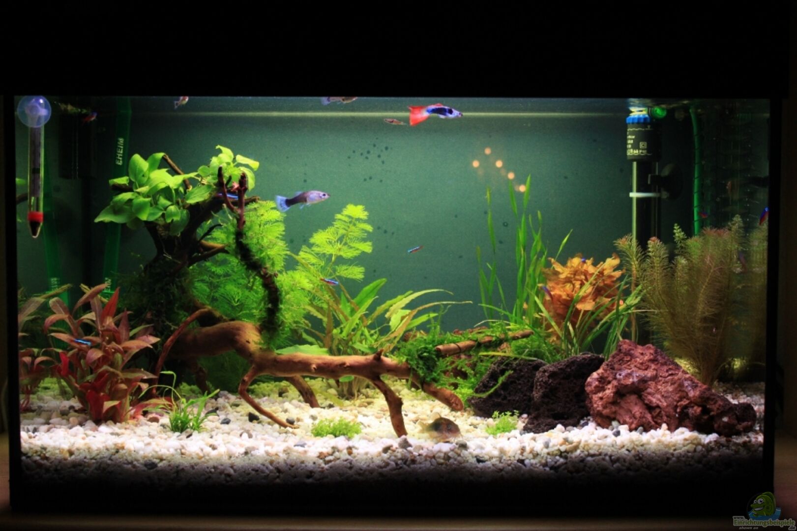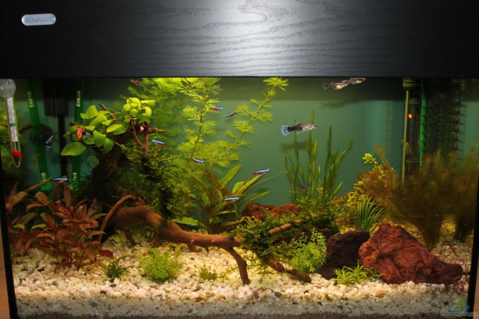 6 Guppys davon 1 Männchen, 10 rote Neons, 2 Ancistren, 10 rote Neons, mehrere Garnelen unbekannter Gattung.