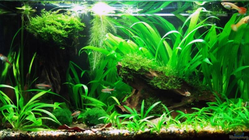Au?erdem ist das Becken schon relativ stark besetzt, und die Guppys werden das sicher noch verstärken ;-) Allerdings ist das Becken ziemlich gut struturiert, so dass das so schon okay ist.