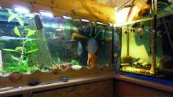 ( Akt ) in arbeit nach 2 Monate war die arbeit vollbracht und das 1000er stand eingerichtet mit in der Wohnstube. Da ich alle Aquarien auf eine Wasserhöhe gebracht habe konnte ich sie mit PVC Rohre verbinden und den Wasserkreislauf durch alle Becken leiten. Da konnte aber kein Fisch durch schwimmen, wie mache ich das blo??? Nach vielen schlaflosen Nächten kam mir die Idee ein ??bergang aus einem kleinen 60 Liter Aquarium zu bauen und siehe da es geht einwandfrei also schnell noch ein paar andere ??bergänge gebaut und alles war perfekt. Runde 2700 Liter Wasser in der Wohnstube war schon schön. Eines Tages stöberten wir im internet und fanden ein super Aquarium für kleines Geld, wir konnten nicht wiederstehen. Das neue gebrauchte Aquarium mu??te unbedingt noch in die Wohnstube nur wie und wohin? Als erstes ein 500 Liter Aquarium raus, das wahr kein problem jedoch passte das gro??e nicht über die Treppe nach oben in die Wohnstube, also über das Garagendach durch das Fenster, also auch kein problem dank