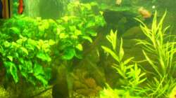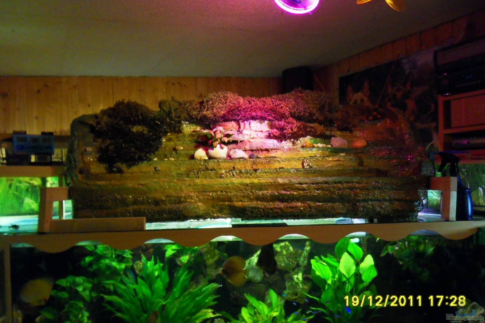 Das 900 Liter Becken mit einer selbstgebauten Rückwand (bestehend aus Schieferplatten, Lochgestein und durchgetrennte Flu??steine einfach mit Aquariumsilikon an der Glasscheibe geklebt), in der rechten hinteren Ecke ist noch ein kleiner Hamburger- mattenfilter mit innenfilterpumpe eingebaut.