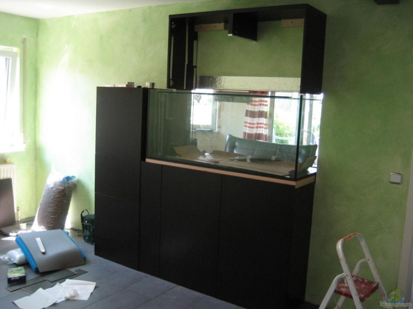 Planung war das Aquarium in eine Schrankwand im Eingangsbereich zu Integrieren, meine Frau kam auf die Idee einen Wanddurchbruch zu machen um das Aquarium auch vom Wohn bzw Esszimmer aus zu sehen.