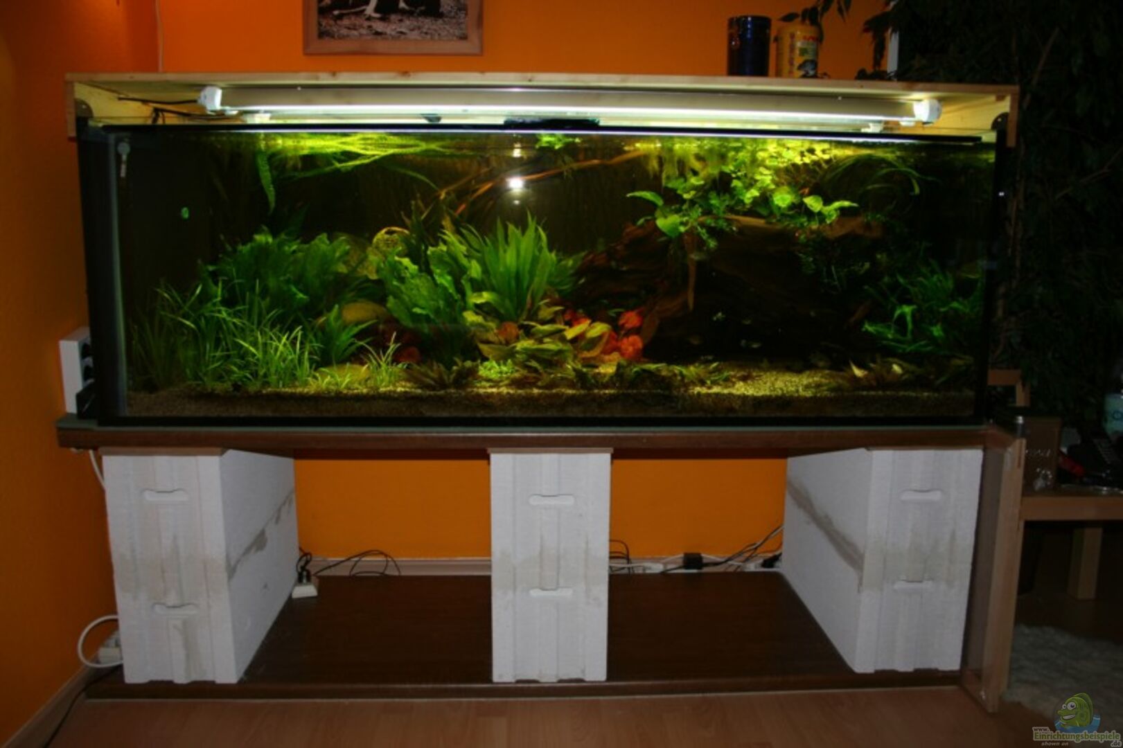 Unterbau aus 2 Arbeitsplatten und 3 Säulen Porenbeton, Lichtkasten aus Kiefernholz selbst gebaut, Sichtblende abnehmbar und Abdeckung aus 2 Teilen (so hat man beim hantieren im Becken immer Licht) Abdeckscheiben aus Plexiglas