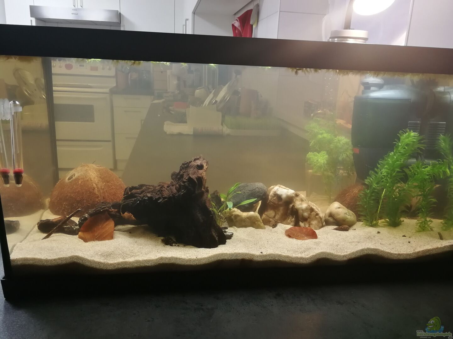 21.01.2021 Filter und Heizstab wurden anders platziert und eine kleine Wurzel mit Kongo Wasserfarn durfte einziehen. Jetzt haben die Pandas noch eine Fläche mehr zum Stöbern :-)