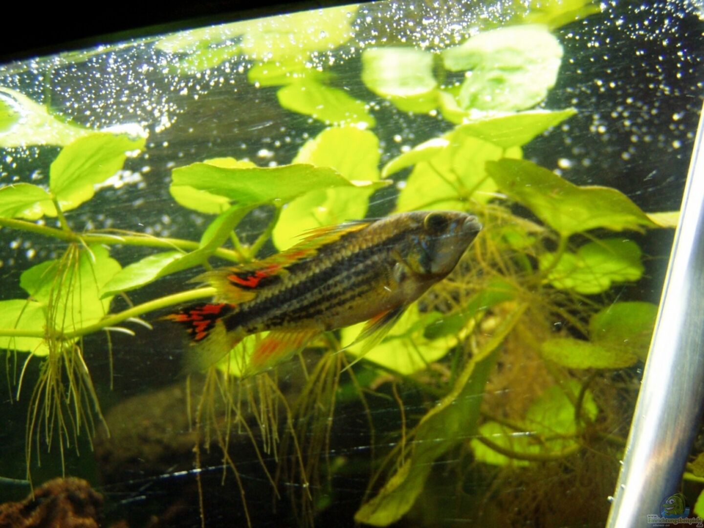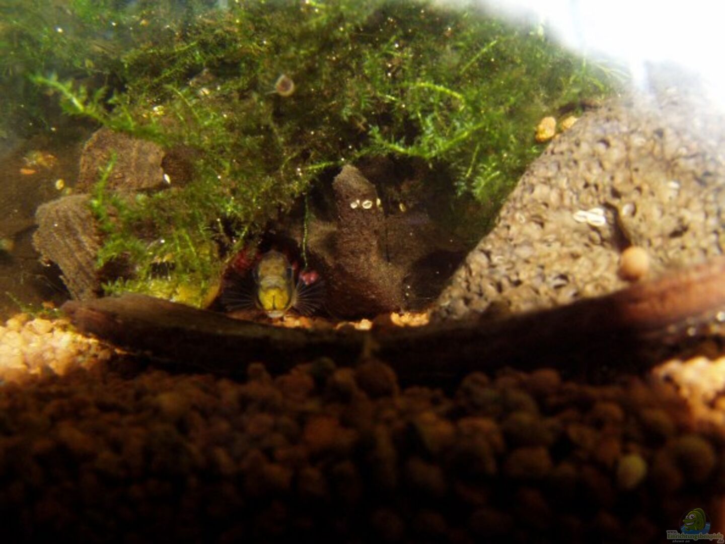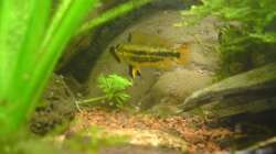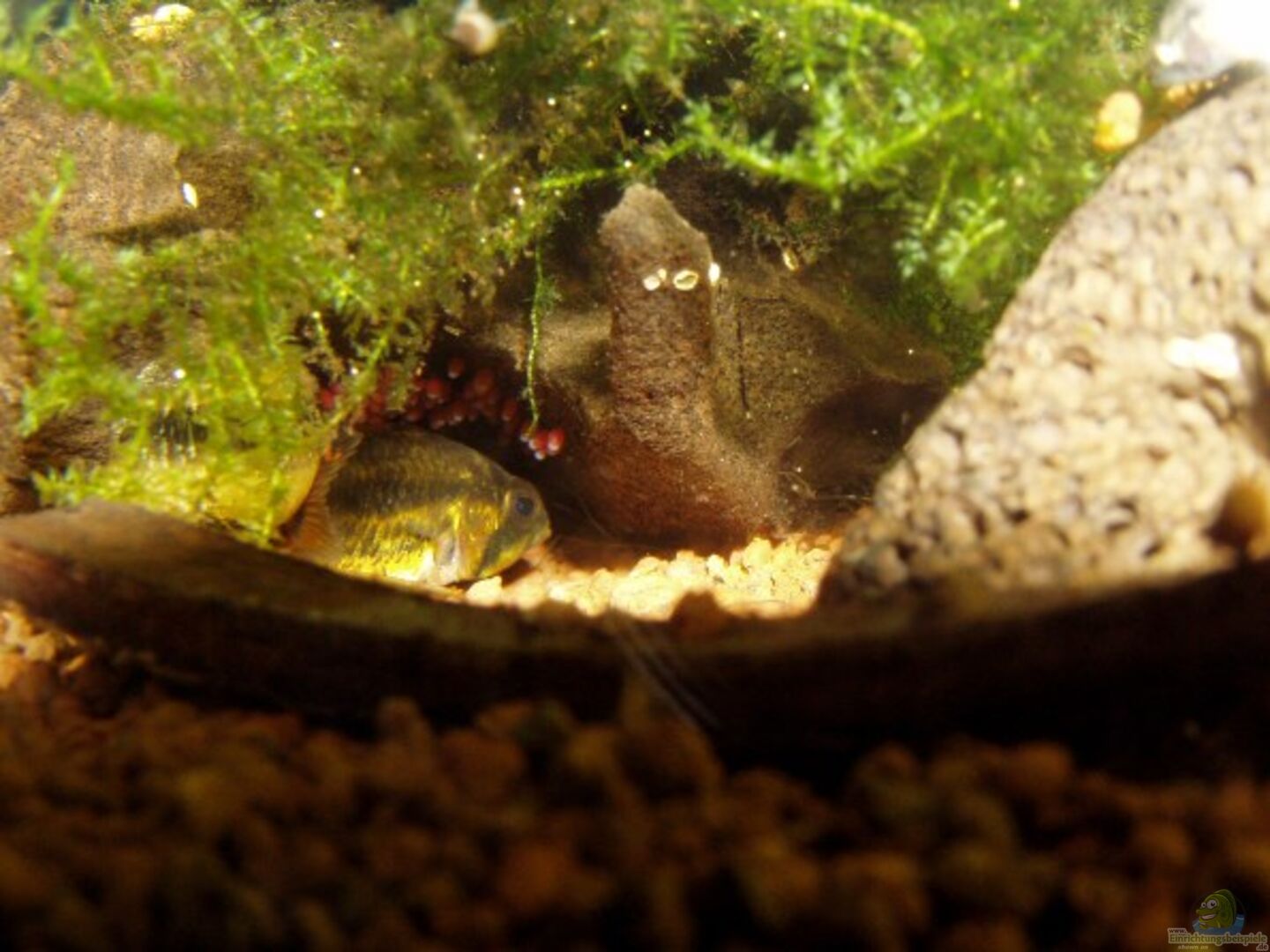 Die Ludwigie ist eingegangen, habe sie entfernt. Mein Barschmännchen hat aus dem letzten Satz Jungfische- den er ja selber gro?? gepflegt hat- eine der Damen erwählt. Zuerst war ich ein wenig unglücklich darüber, weil ich lieber ein grö??eres, stärkeres Weibchen gehabt hätte, aber nachdem das kleine Weibchen 2 Tage bevor sie zum Händler gegangen wäre eine Schar Jungfische freischwimmen geführt hat, löste sich der Plan in Luft auf. Aber- die junge Dame macht das hervorragend, hat ihn im Griff, hat die Zwerge im Griff. Top.