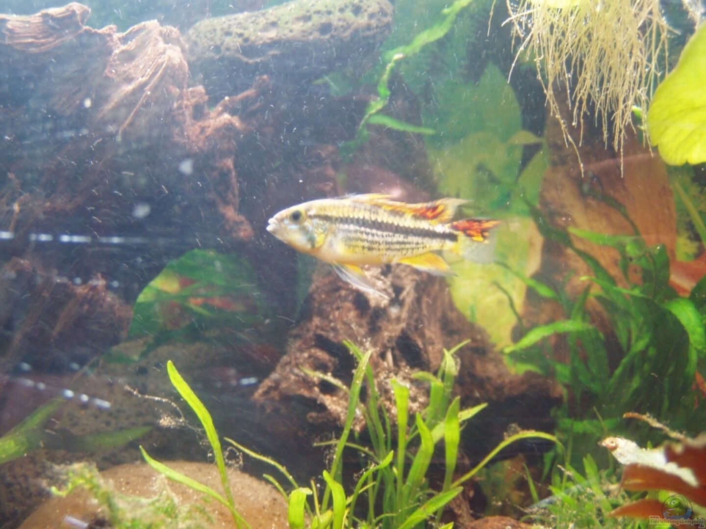 das Becken ist nicht als reines Südamerika Becken konzipiert, sondern soll voerst das neue Heim eines Paares Apistogramma Cacatuoides werden. Es ist so eingerichtet, das ein schöner Brutplatz (Höhle) da ist, ein wenig Totholz (Mangroove) und die Möglichkeit sich zwischen den Pflanzen aus dem Weg zu gehen.