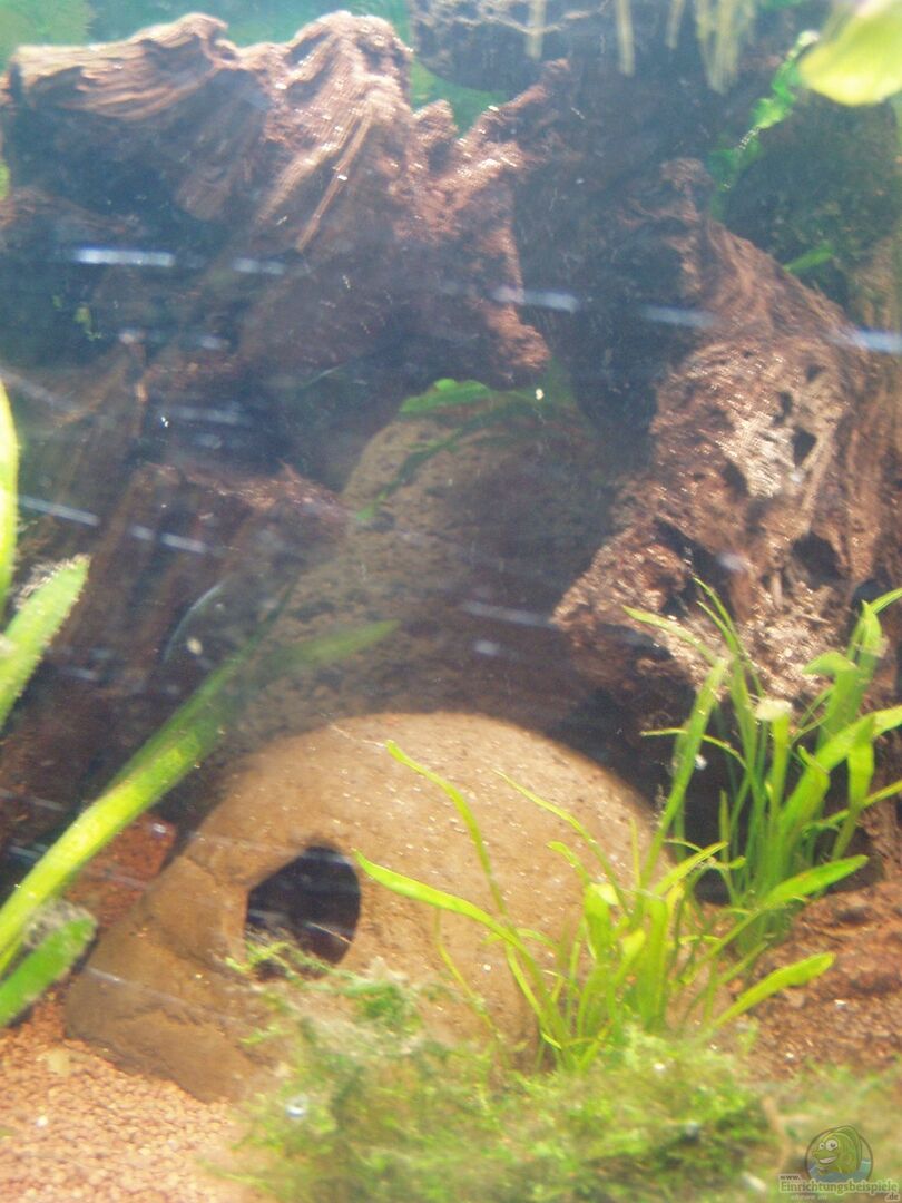 Fast hätte ich es vergessen- schon ziemlich zu beginn habe ich Seemandelbaumrinde mit ins Becken gegeben. Sie sieht zum einen nett aus, zum anderen denke ich, das sie nach allem was ich so an Infos finden konnte a) den Garnelen, b) den Fischen und c) dem Laich ganz gut tut. Diese wird alle 3 Wochen um ein Stückchen erweitert, ältere (ausgelaugte) Stücke verbleiben als Deko im Becken.