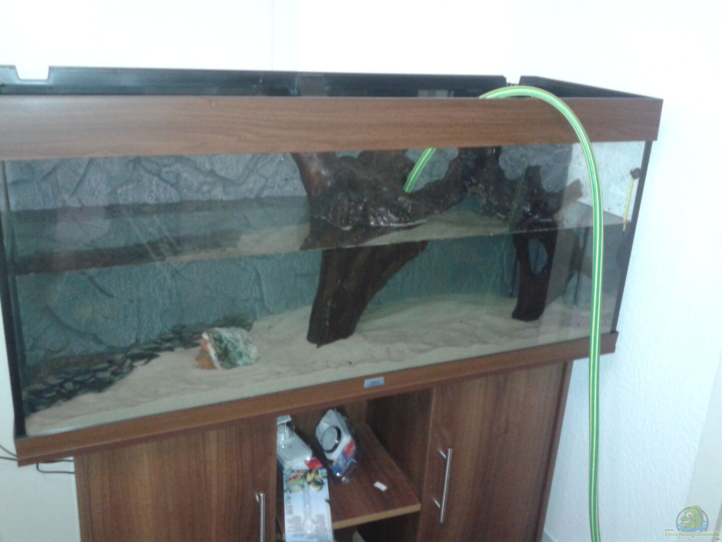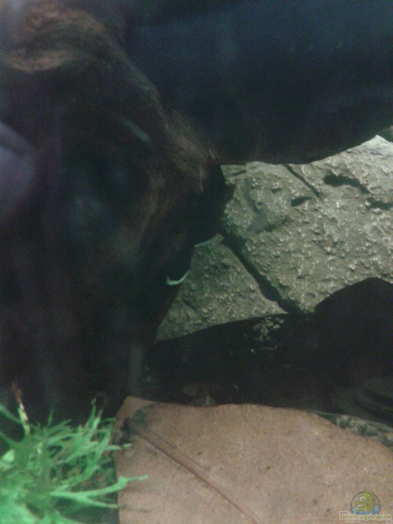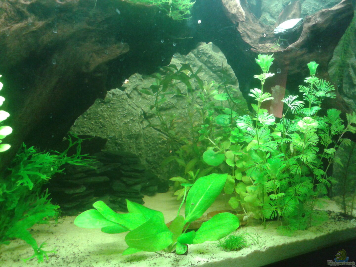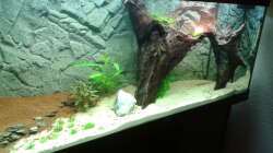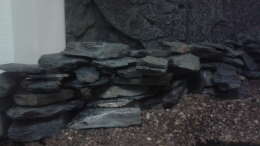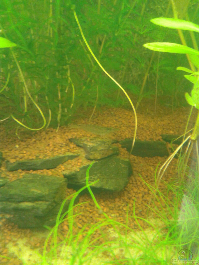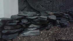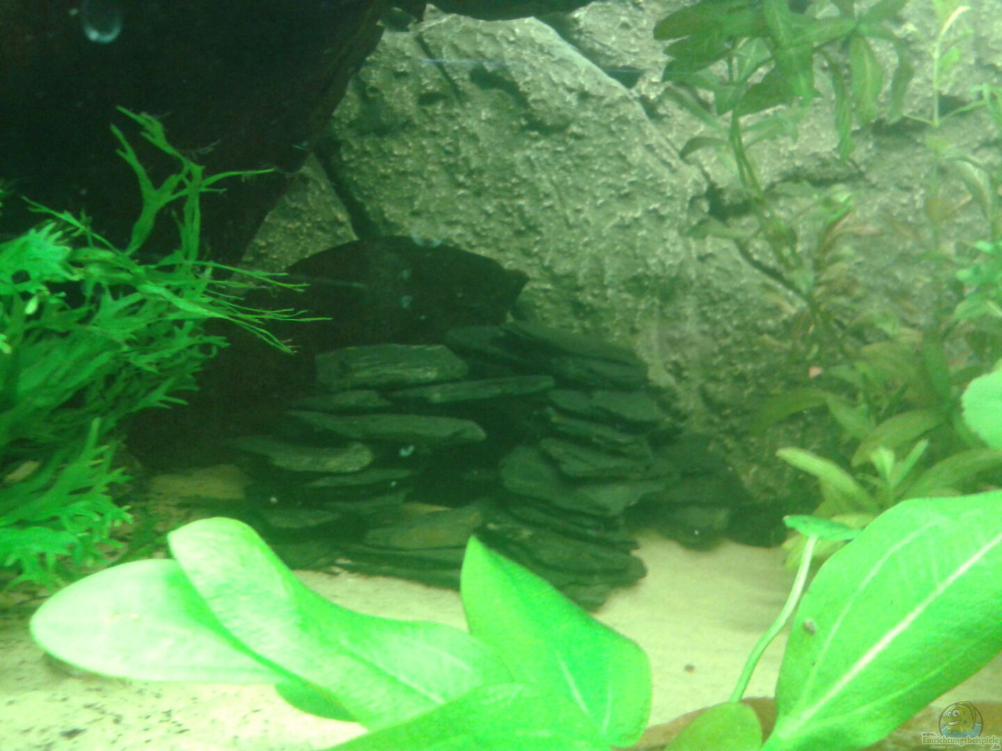 - eine selbstgebastelte Schieferterrasse mit kleinen Verstecken und Nischen in der linken oberen Ecke des AQ.