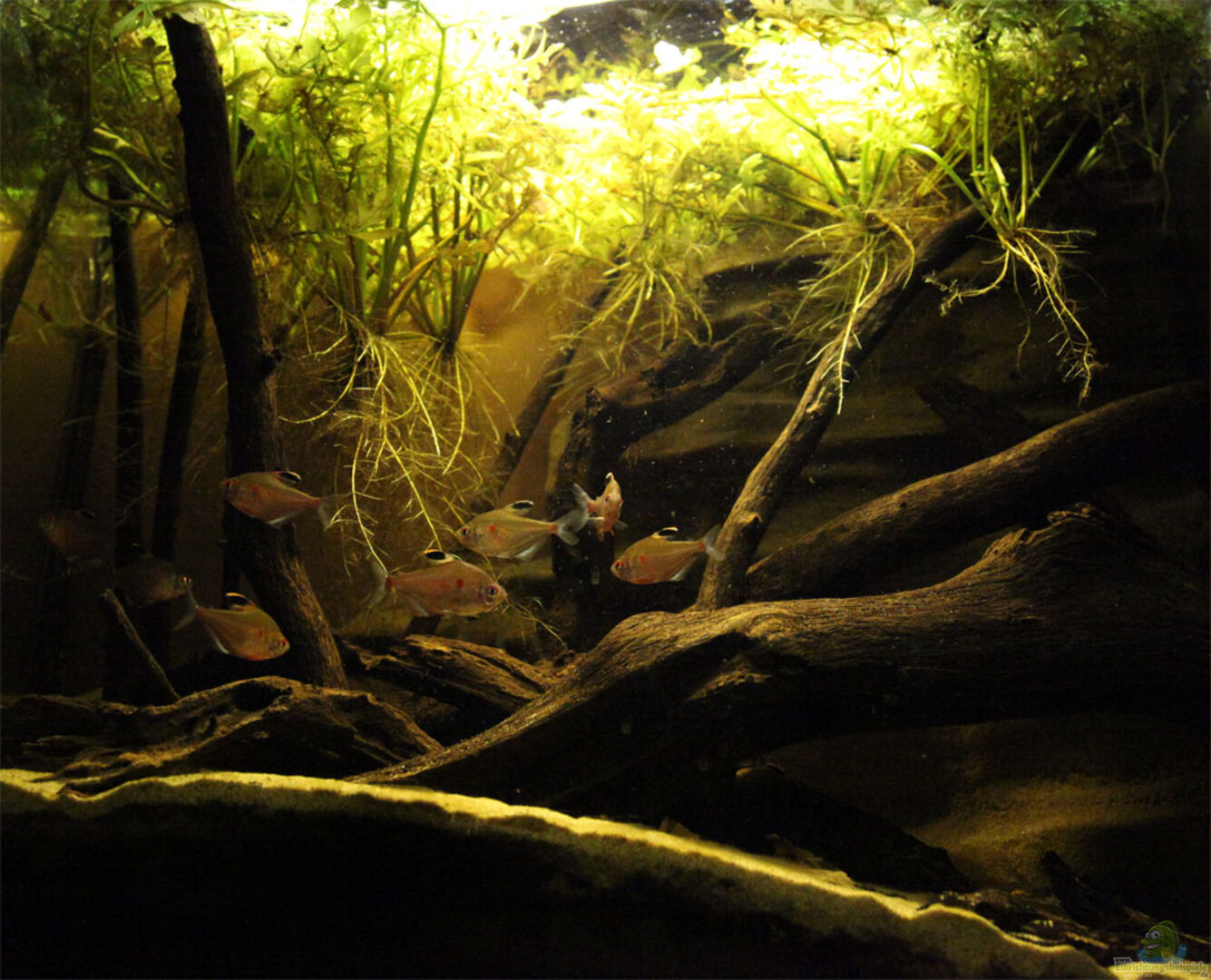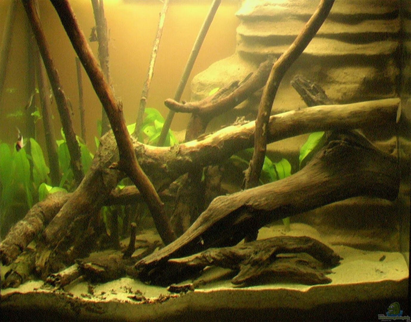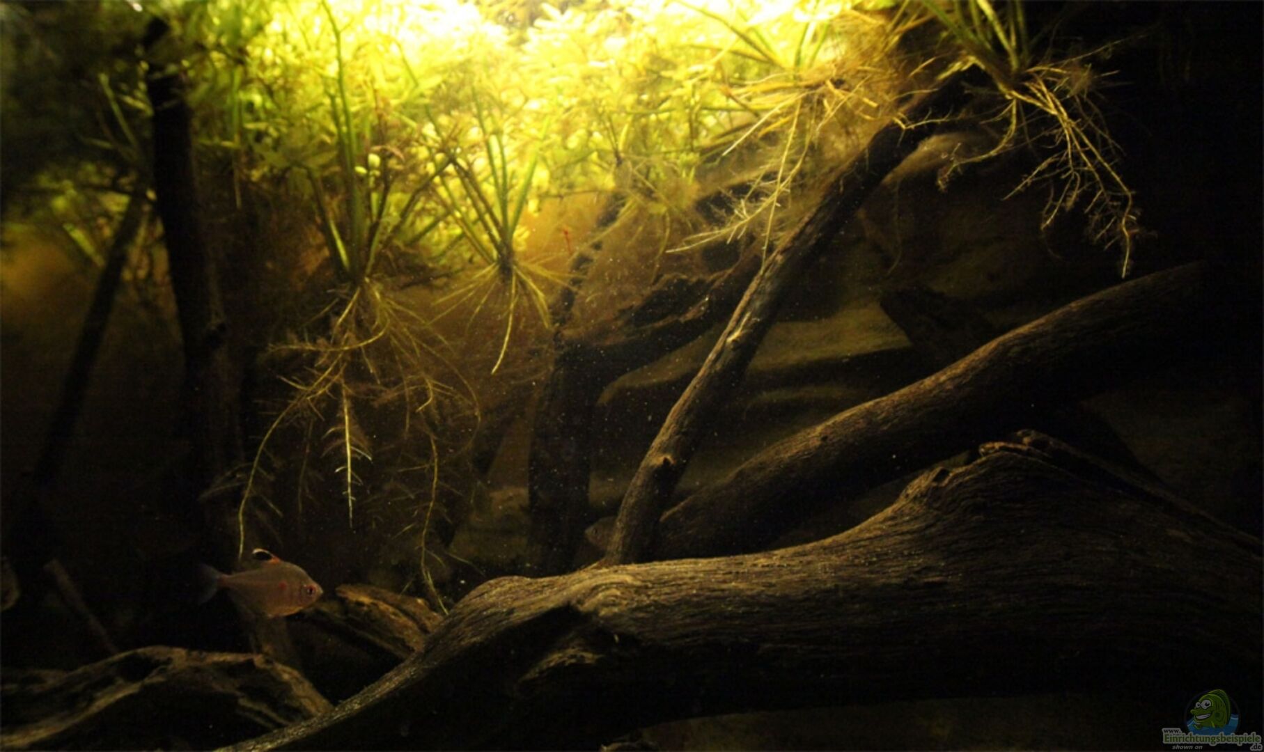 Die Ufer des Rio Negro sind ein Sammelsurium an versunkenen Sträuchern, ??sten und Bäumen. daher wurden im Becken ebenfalls ??ste statt Wurzeln verwendet, arrangiert wurde das Ganze so, da?? ein Teil wie ein ´abgesoffener´ Strauch aussieht (links hinten) und vorne eher gro??e ??ste ins Wasser geklatscht sind.Statt der verwendeten 2006 verwendeten Muschelblumen bin ich inzwischen mit dem schwimmenden Hornfarn viel zufriedener, da er ebenso als Kosmopolit im Rio Negro vorkommt, aber im Gegensatz zu den Muschelblumen viel verkrauteter wirkt und längere Schwimmwurzeln Die Panzerwelse und Socolofi Kirschflecksalmler stammen ebenfalls aus dem Rio Negro. Die Otocinclus sind als ehemaliger geografischer Stilbruch inzwischen umgezogen - Das Becken veralgt Dank der schummrigen Beleuchtung dennoch nicht. Die Fische danken das mit tollen Farben und jeglichem Fehlen von Scheu - vor allem die Panzerwelse ziehen ständig im gro??en Schwarm durchs Becken.
