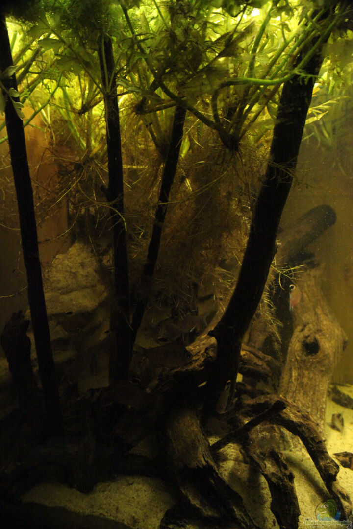Inzwischen habe ich den Besatz umgestellt und die zwar im Rio Negro vorkommenden, aber auf Sandflächen eher deplazierten Echinodori entfernt. Auch die Muschelblumen mu??ten zugunsten des passenderen schwimmenden Hornfarnes weichen.