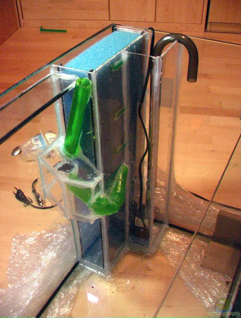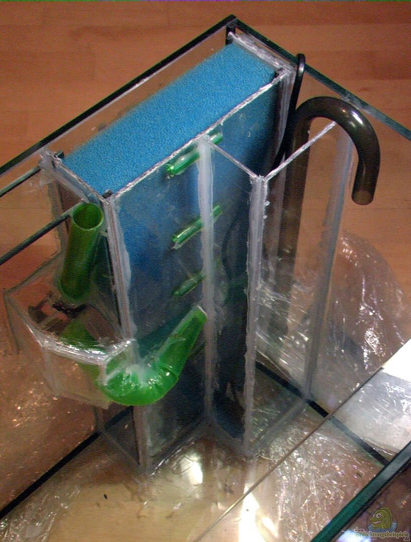 Die Ansaugung ist so gestaltet, da?? sie ca 10 cm über dem Bodengrund liegt. so wird verhindert, da?? sich der staubfeine Sand im Filter fest setzt. Das Wasser passiert dann den HMF (19x49x5cm = 880 cm²) (hier ist das Thermometer) und wird in die Filterkammer geleitet, die mit 500cm³ Torfgranulat gefüllt ist. Hier befindet sich auch der Heizstab). Das Wasser wird anschlie??end von einer Eheimpumpe EHEIM compact 300 wieder ins Becken geleitet.