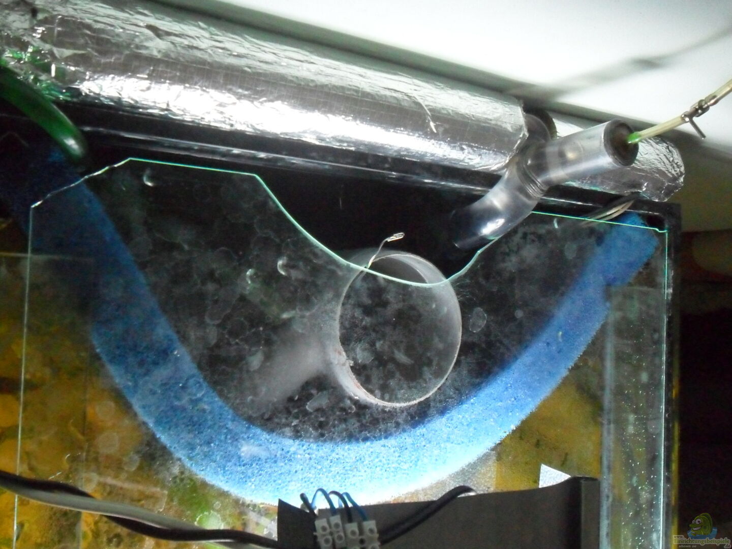 meine neueste errungenschaft ist der passive filter hinter der matte. der wird nur von dem auströmenden hochgepumpten wasser angetrieben. unten eine öffnung 40er ht rohr und oben der difusor wie man so schön sagt. gefüllt nur mit 2 filterwürfeln 6x6x20 cm mit loch in der mitte und selbstgebastelten runden mattenfiltern, die in das 100ter ht rohr reinpassen. das geht ganz gut, es fehlt alldieweil noch bisl mehr kraft von der pumpe aber das mache ich die woche gleich...
