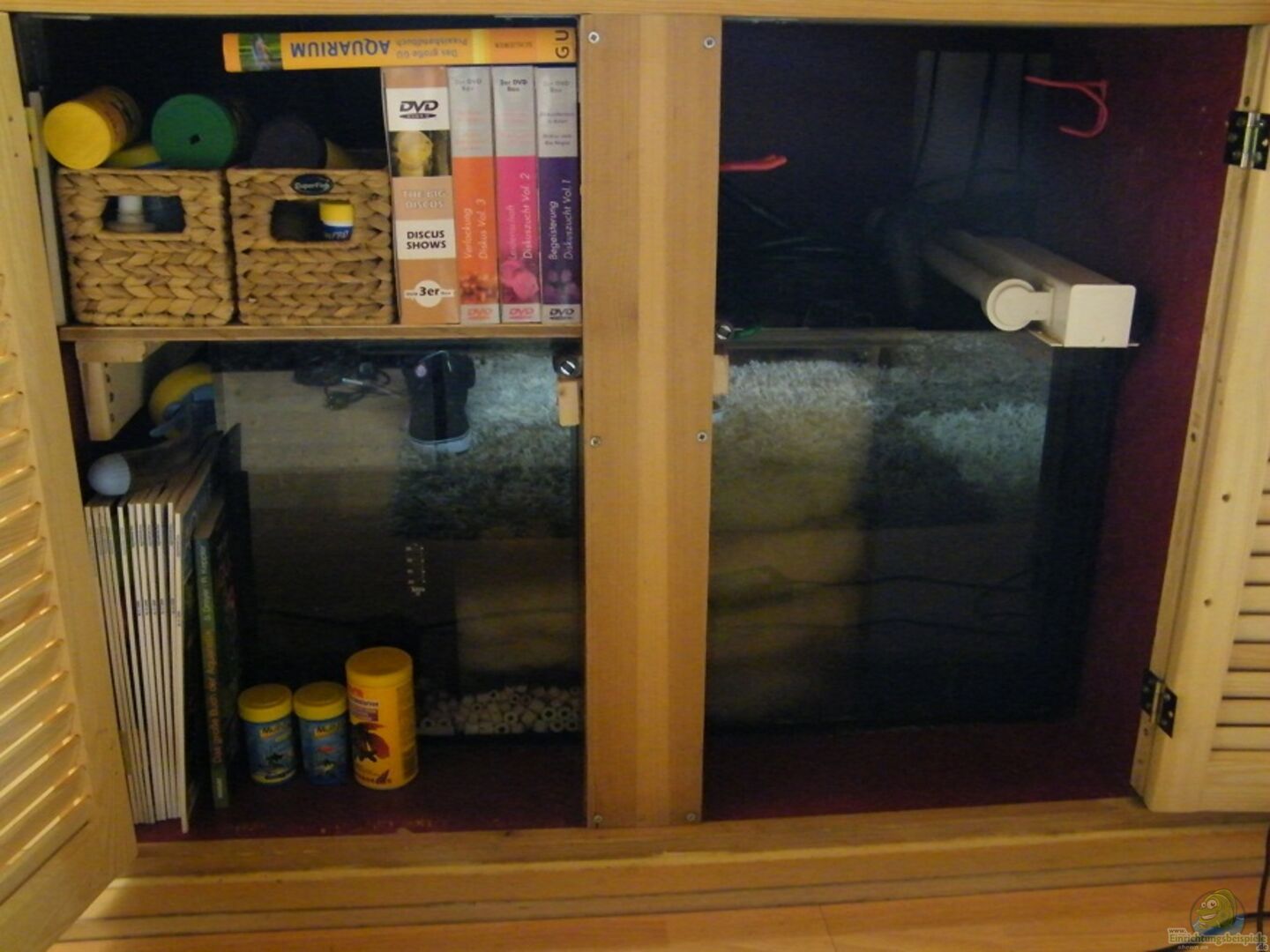 Steckbarer, umlaufender Holzrahmen am Aquarium, 12 cm hoch.Filterbecken im Unterschrank, 80x35x40-112l, mit 4 Kammern.Alle Rohre für Wasserzu- und Ablauf aus Hart-PVC mit Verschraubungen und Notüberlauf intregiert, Aquarium kann bei Verstopfung des Ablaufes nicht überlaufen.