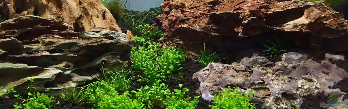 Im vorderen Teil der oberen linken "Terrasse" habe ich Eleocharis pusilla gepflanzt. Hinten links habe ich einen Pogostemon erectus gepflanzt, damit die Rückwand verdeckt ist. In der Mitte (in der Schlucht) wächst ein Glossostigma elatinoides ebenfalls zu einem leichtem Teppich zusammen. Hinten rechts wächst eine Alternanthera reineckii 'Mini', damit der Eckfilter verdeckt wird. Au??erdem habe ich mich für diese Pflanze entschieden, da sie mit ihren roten Blättern ein kleiner Blickfang gegenüber den anderen grünen Pflanzen ist.
