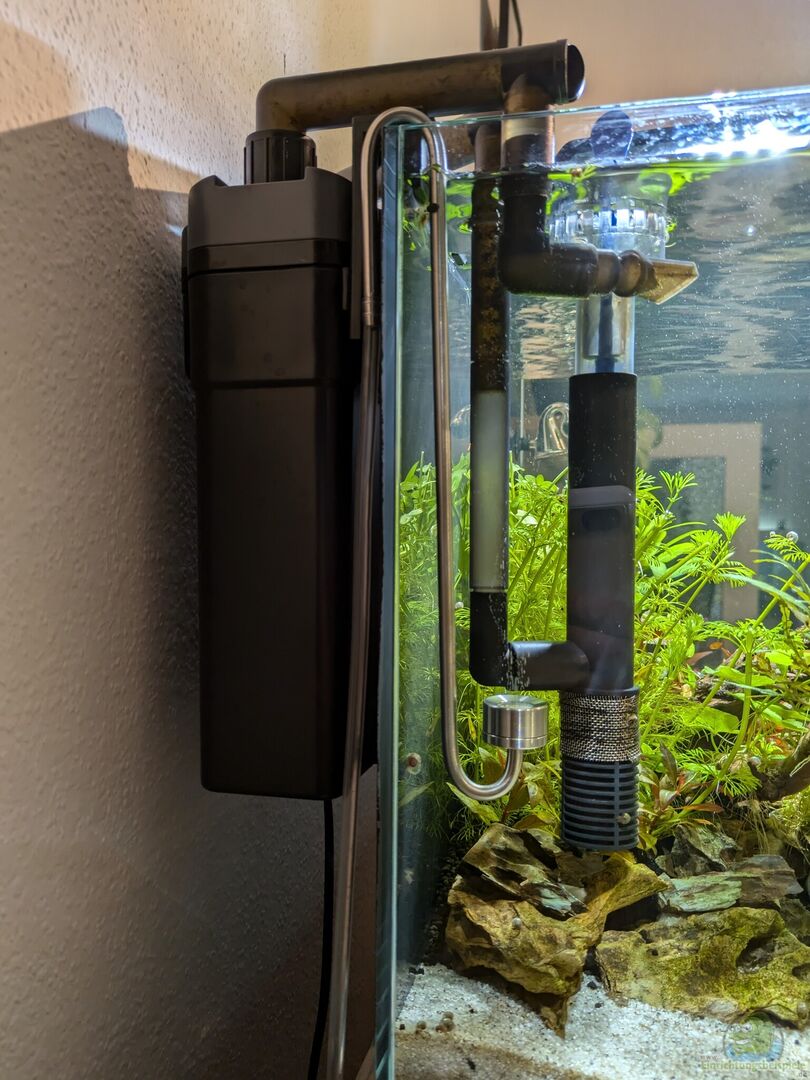 Die Besonderheit ist, das man ihn einfach an das Aquarium-Glas, wie einen klassischen Hang-On-Filter einhängen kann.