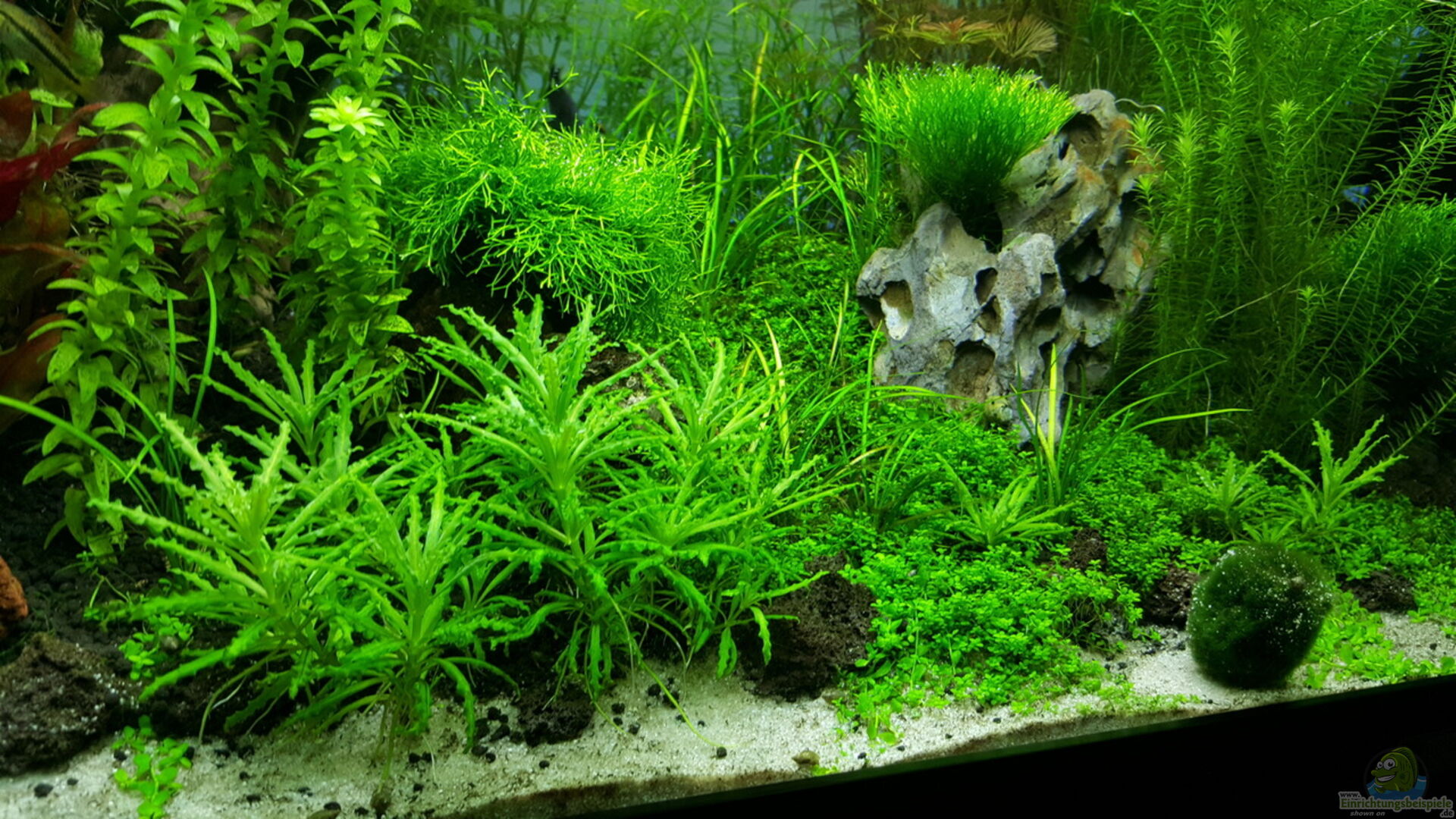 21.11.2015: Die Algenplage habe ich mittlerweile einigerma??en im Griff und diese befinden sich aufgrund des guten Pflanzenwuchses auf dem Rückzug. Die Beleuchtungszeit habe ich ebenfalls ein Stück zurück genommen gehabt, was wohl eine gute Entscheidung war. Letztes Wochenende hatte ich Zeit ein wenig umzugestalten, vorallem was das Mooskraut in der Mitte des Beckens betrifft. Das Kraut wuchs anders als ich dies erwartet habe und war einfach zu dominant für diesen Standort. Bei der Gelegenheit habe ich meine Mooszucht in die Gestaltung der linken Seite des Beckens einflie??en lassen, dadurch entsteht eine warm runde Atmosphäre im Becken. Ich werde sicherlich die nächste Zeit noch das ein oder andere an der Gestaltung machen, aber immer Step by Step.