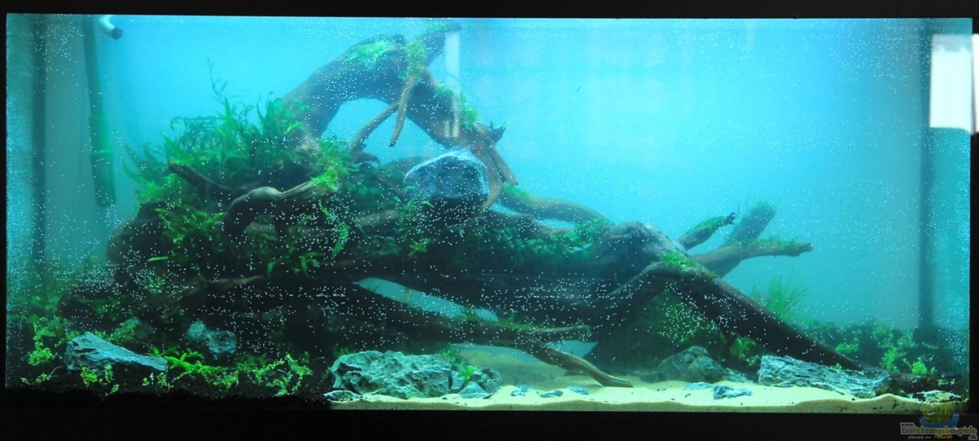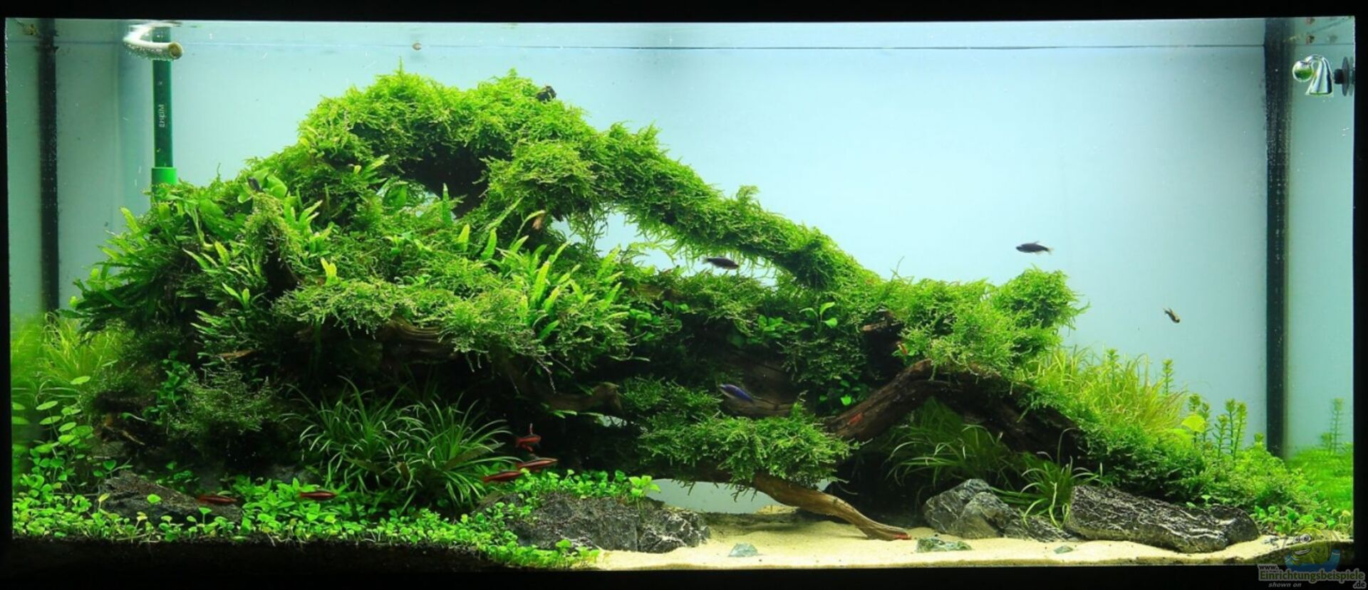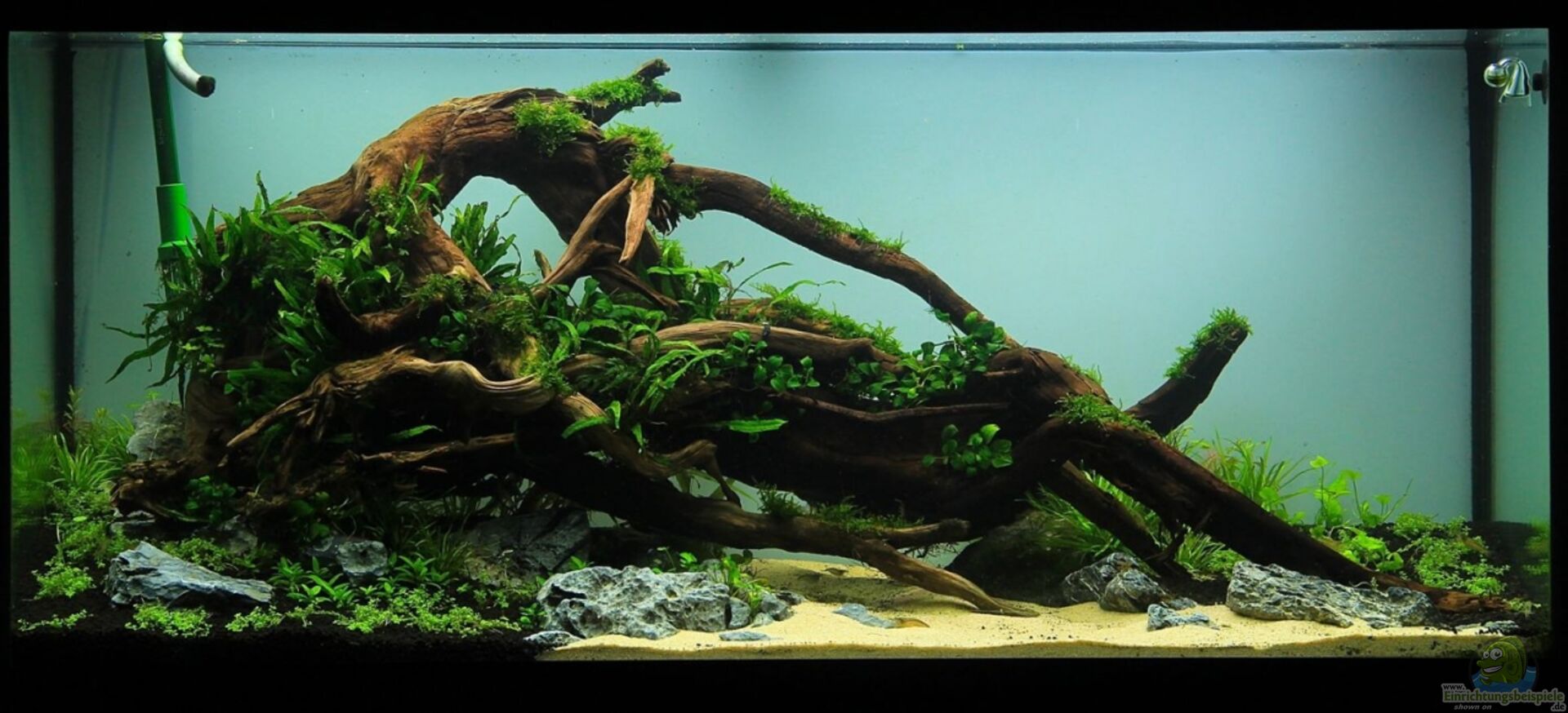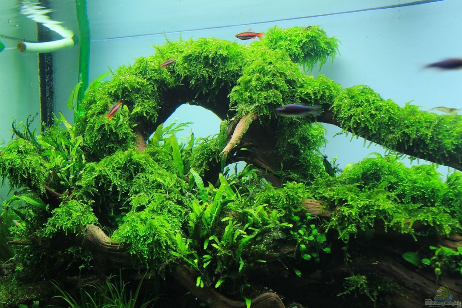 Mit Sekundenkleber lassen sich Moose auf Hardscape kleben. Solch ein Kleber härtet so schnell, dass das Moos zum Beispiel während des Wasserwechsels aufgebracht werden kann. Ich trockne die entsprechenden Stellen so gut wie möglich mit einem Tuch und setze drei Klebepunkte auf die entsprechende Stelle. Anschliessend drücke ich vorsichtig eine kleine Menge des Mooses auf die Punkte. Kurze Zeit später sollte das Moos fest genug angeklebt sein, so dass das Wasser wieder eingelassen werden kann. Diese Methode der Moosverarbeitung habe ich am Häufigsten in diesem Layout angewandt, da die Wurzel sehr verzweigt ist und ich nur schwer das Moos auf die ??ste aufwickeln konnte. Weder Fische noch Pflanzen haben in diesen Layout (und auch nicht in den vorigen Layouts) Schaden durch den Sekundenkleber genommen, aber selbstverständlich übernehme ich keine Garantie für die heimischen Versuche anderer Aquascaper!