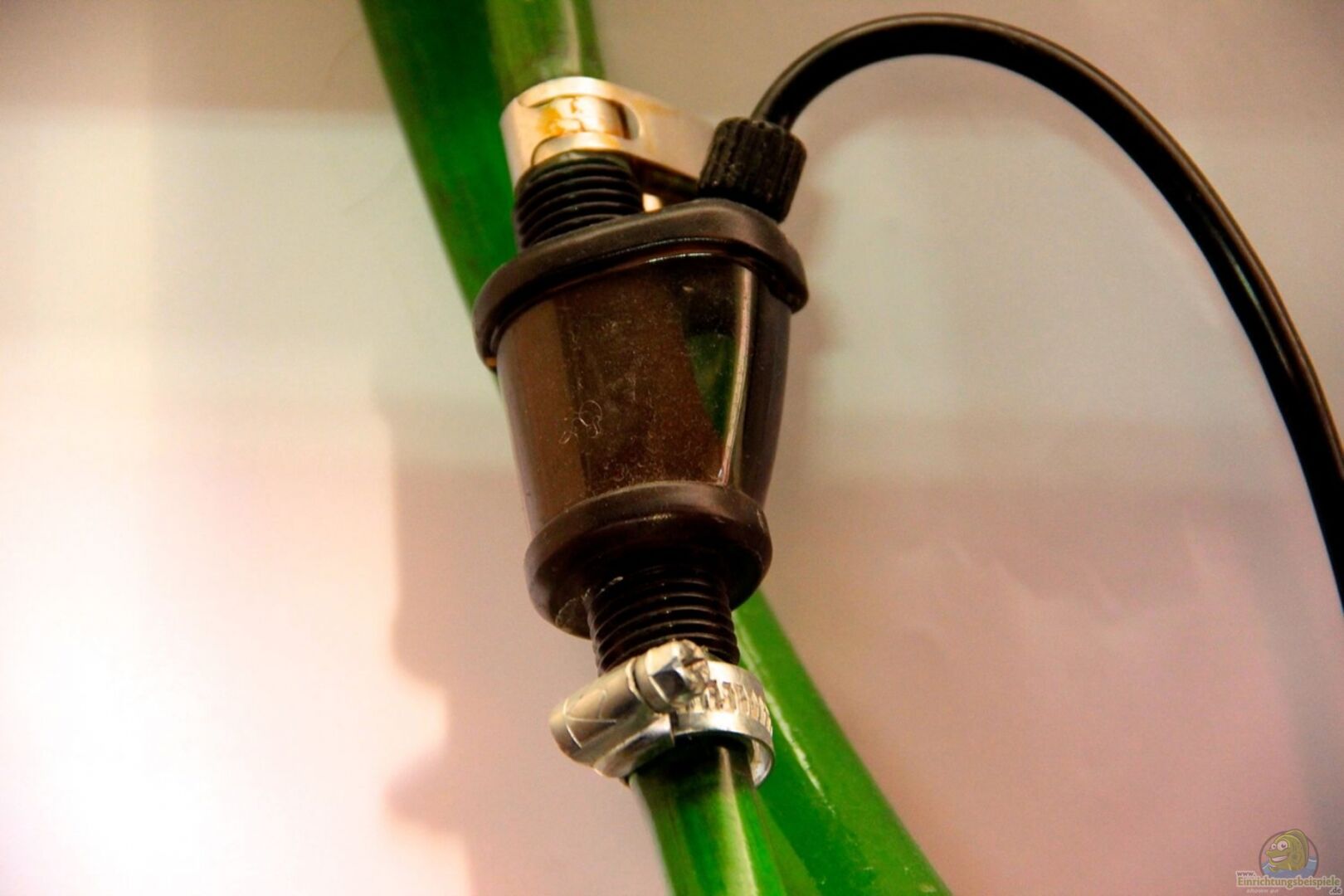 Auf dem Foto ist der Inline Atomizer zu erkennen. Dieser wurde in den Filterauslauf eingebaute und mit Schellen fixiert. Da der Atomizer aus Hong Kong importiert wurde, sind diese Schellen nötig. Zumindest denke ich, dass der Durchmesser europäischer Schläuche ein anderer zu sein scheint????. Gut zu sehen ist der schwarze CO2 Zulauf und die Keramikmembran im Körper des Atomizers.