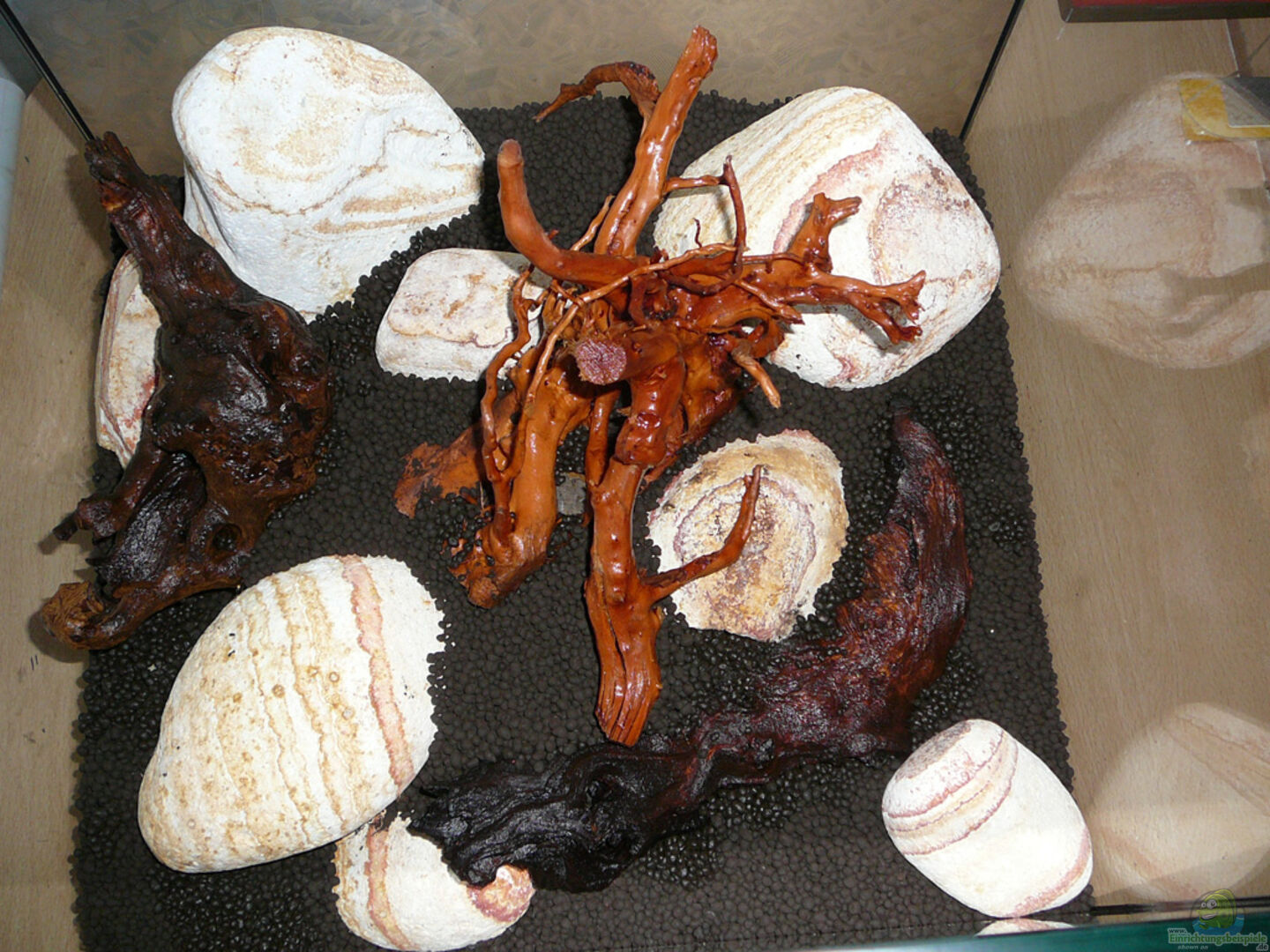 Desweiteren habe ich eine Rote Morkien Wurzel dezentral ins Becken gesetzt auf der die Anubias Nana Bonsai sowie die Bolbitis heteroclita difforms platz finden sollten. Zwei weitere Wurzeln wurde schräg vor und links neben der Hauptwurzel plaziert. Sieben Regenbogensteine verschiedener Grö??e gaben dem Becken seinen Namen und bilden einen schönen Kontrasst zum Grün der Pflanzen und dem dunklen Braun der Wurzeln.