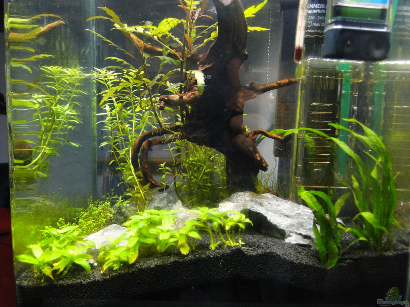 Das Aquascape wurde noch ein wenig umgestaltet, und es sind 6 Amanogarnelen eingezogen (sind noch recht klein, werde sie in ein grö??eres Aquarium umsetzen wenn sie grö??er sind). Der fiederspaltige Wasserfreund und die rundblättrige Rotala wachsen bestens, die anderen Pflanzen eher mä??ig.