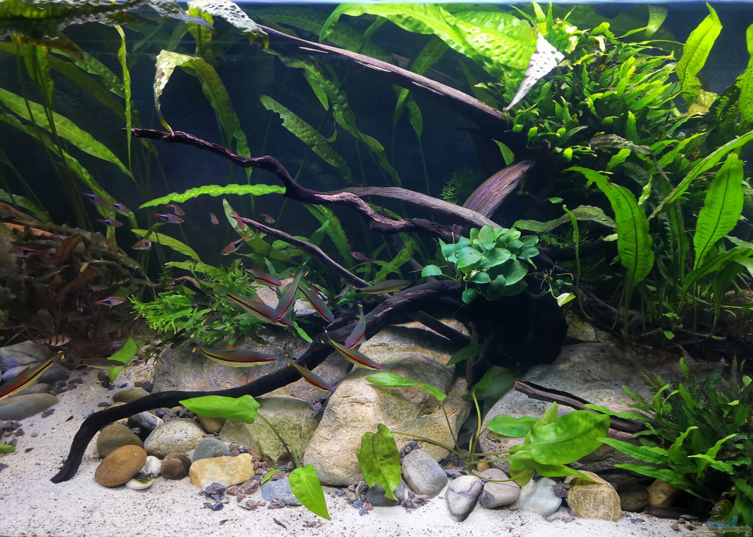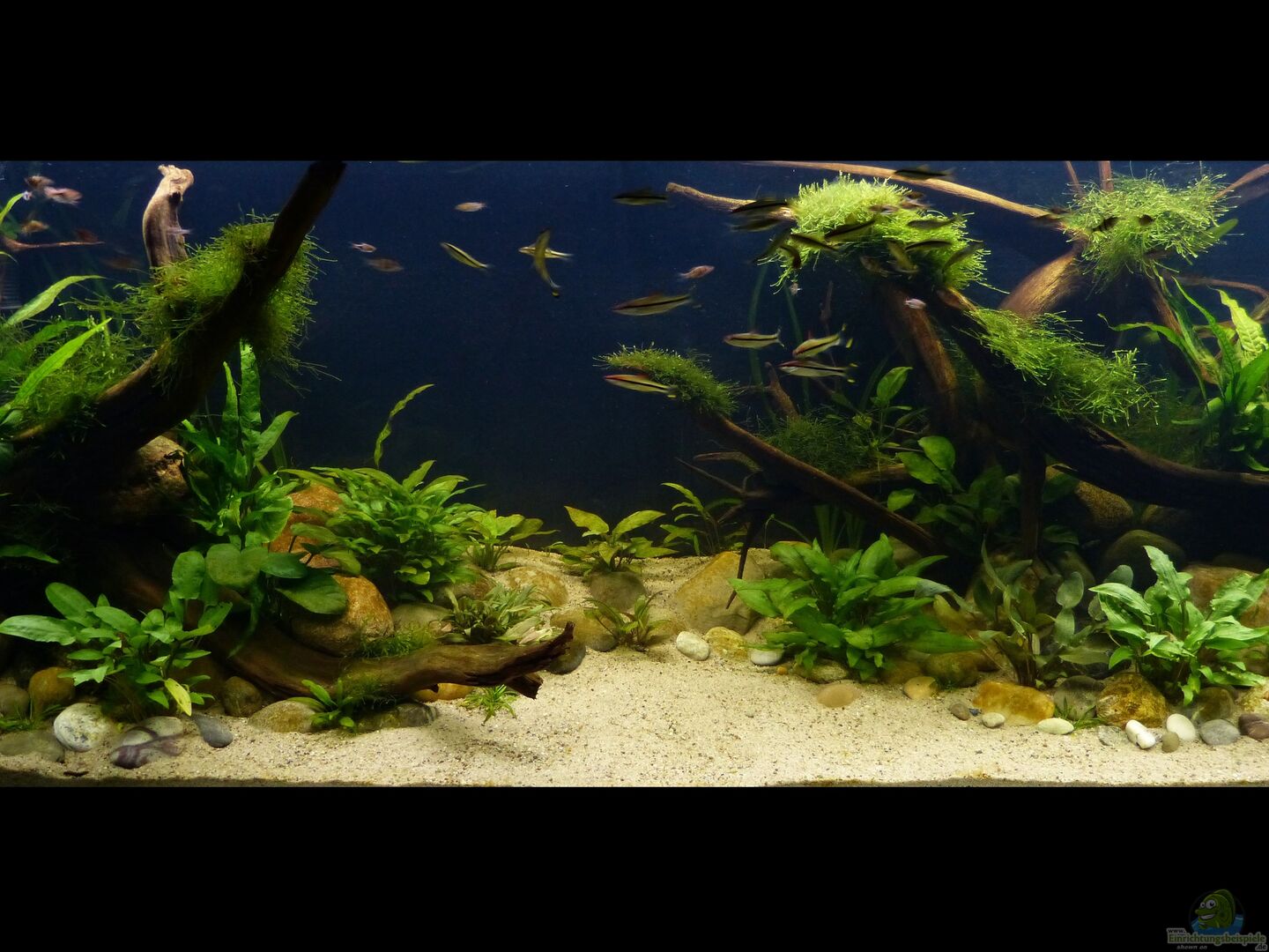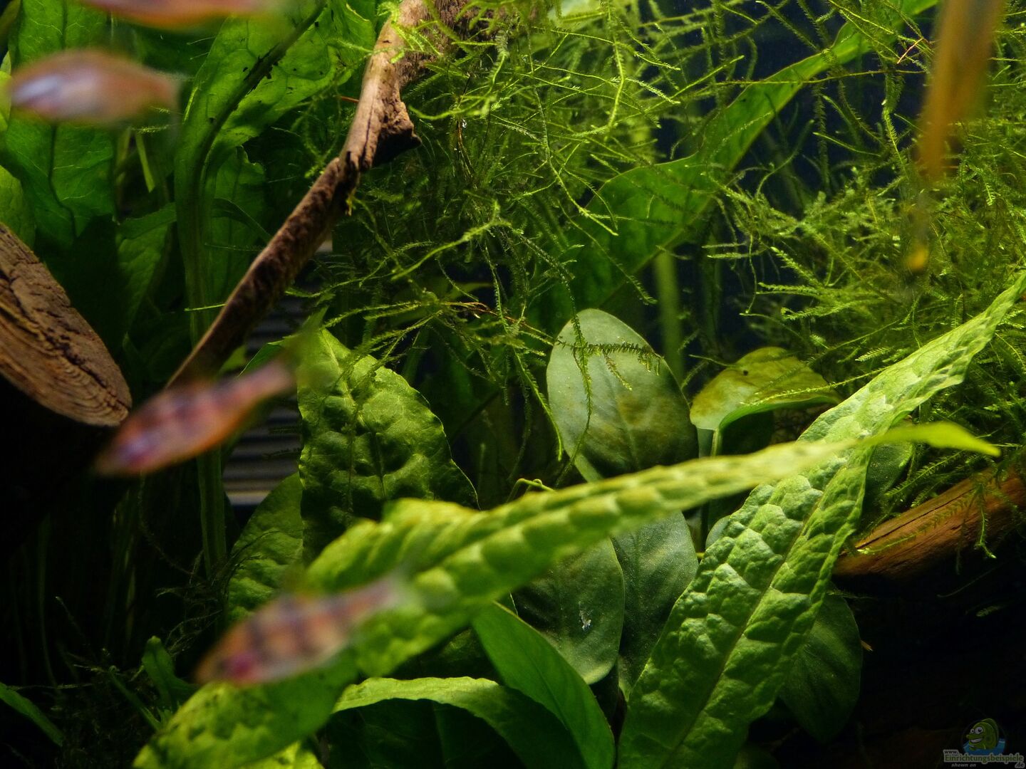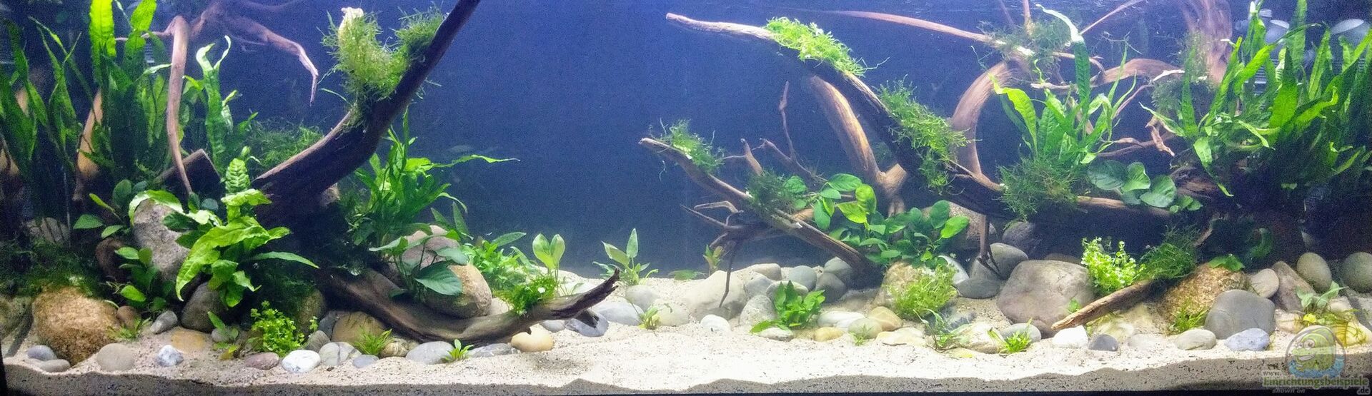 Nach 1 1/2 Jahren lässt sich sagen, dass mir das für meinen persönlichen Geschmack bisher ganz gut gelungen ist. Einzig die Moose habe ich nicht geschafft, dauerhaft in diesem Becken zu etablieren. Leider machen mir hier die puntius denisonii einen Strich durch die Rechnung, da sie das Moos auf der Suche nach Futter regelrecht zerpflücken.