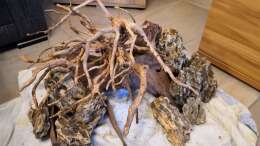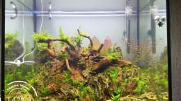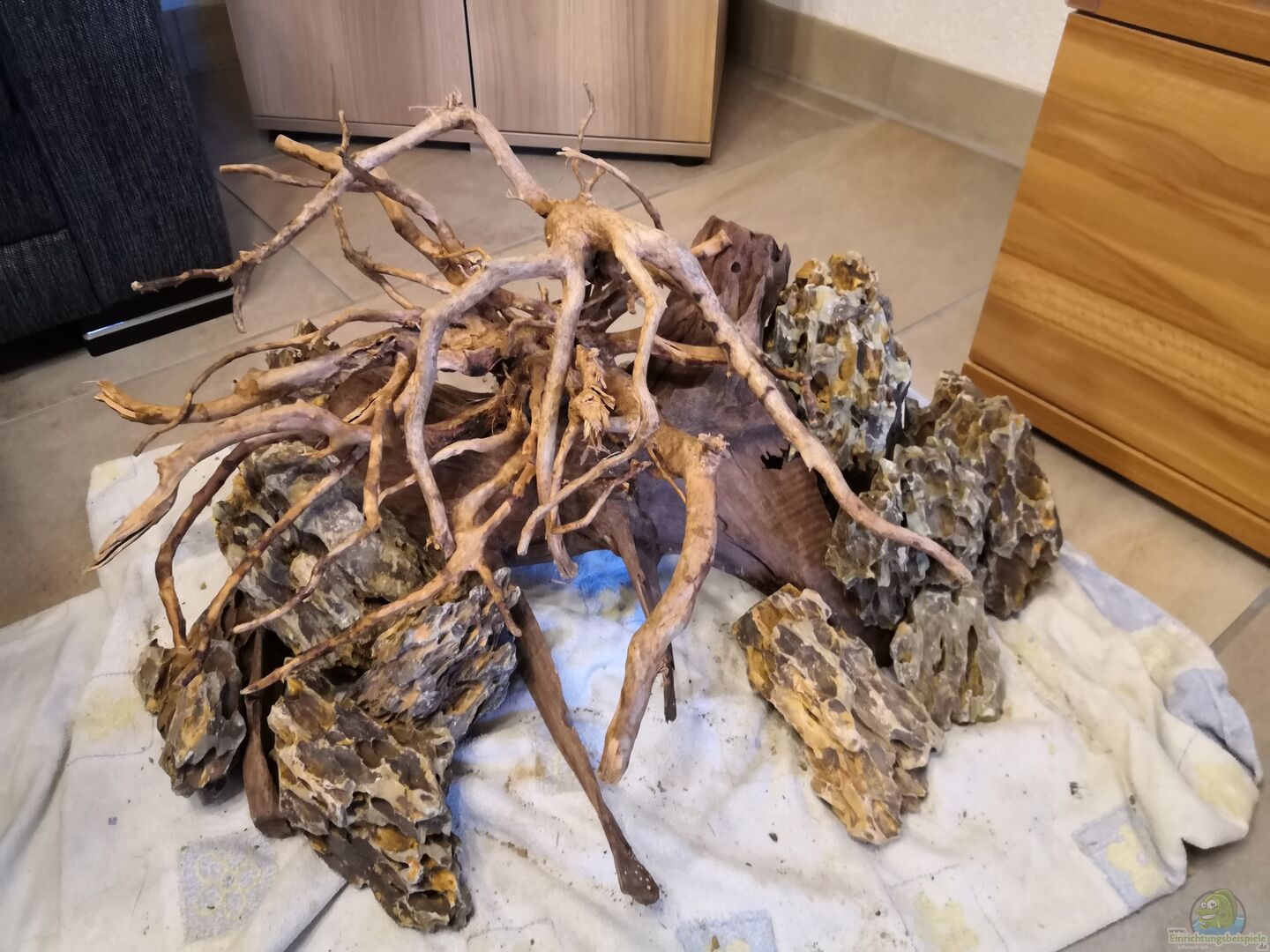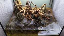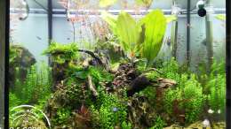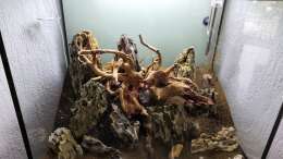 Hardscape aus Drachenstein und einer gro??en Spiderwood Wurzel die ich mir zurecht geschnitten habe. Alles bepflanzt mit verschiedenen Bucephalandra's, die sich mittlerweile zu dichten Büscheln und Teppichen ausgebreitet haben und bis zur Wasseroberfläche gewachsen sind.