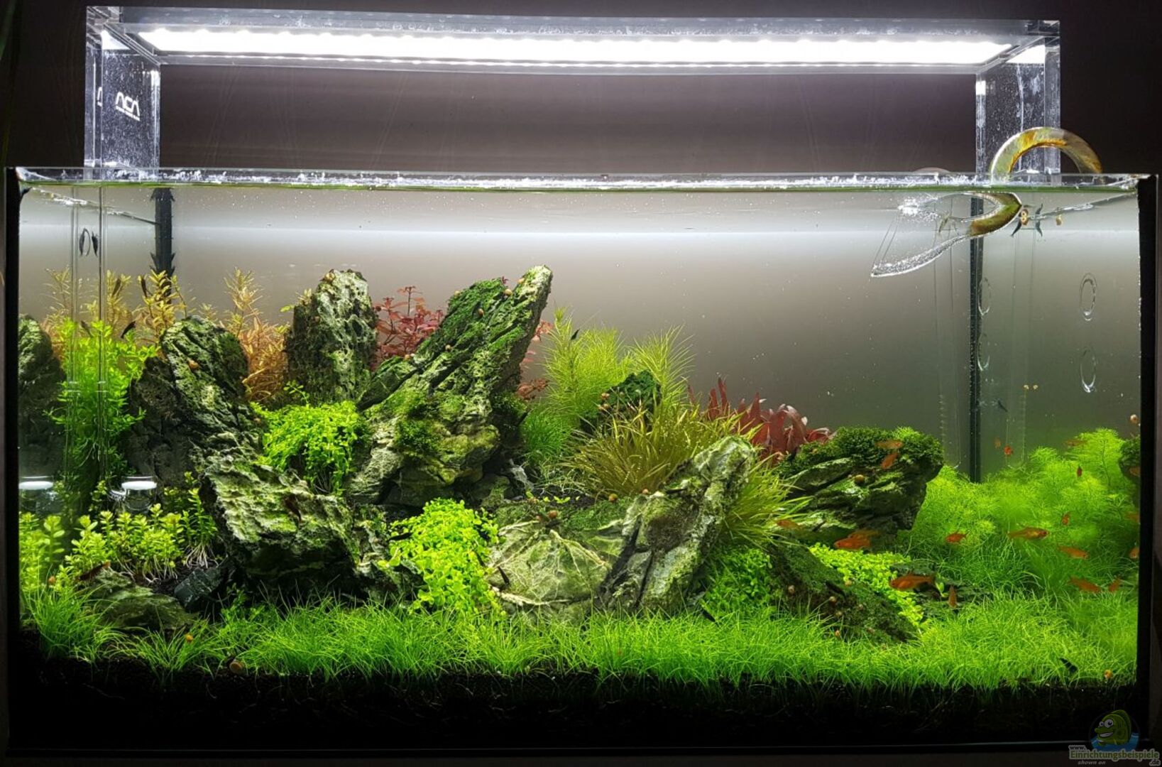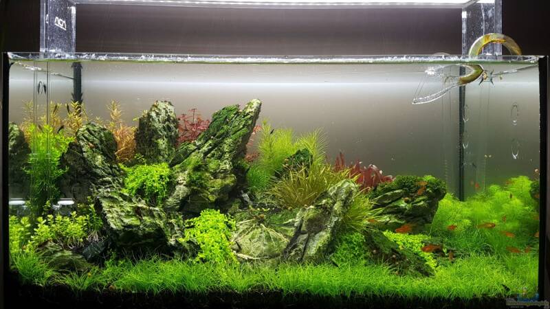 Da viele meiner Aquarienlayouts aus Wurzeln und Steinen bestehen, wollte ich bei diesem einmal nur Steine und Pflanzen ausprobieren. Ob man es als ein reines "Iwagumi" bezeichnen kann, wei?? ich nicht. Da ich hier doch eine grö??ere Auswahl an Pflanzen getroffen habe. Im klassischen Iwagumi-Stil werden, meiner Ansicht nach, lediglich 2 - 3 Pflanzenarten eingestezt. Mal schauen wie es sich im Laufe der Zeit entwickelt.