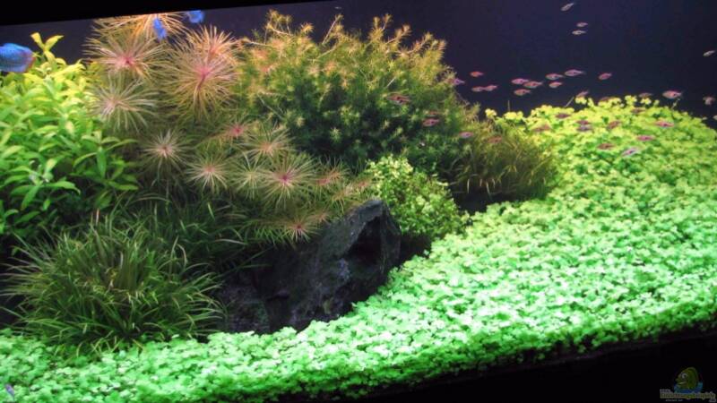 Auf dem Foto mit der Seitenansicht lässt sich gut erkennen, dass ich die Hydrocotyle so getrimmt habe, dass sie nach Hinten ansteigt. Somit wird die Illusion von "Tiefe" im Becken verstärkt.