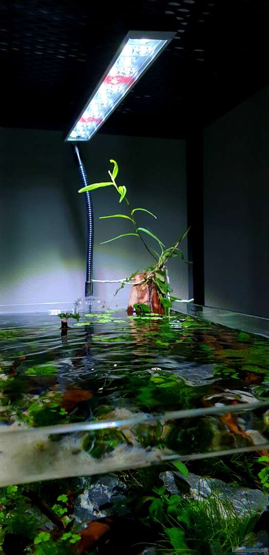 Emerser Teil geändert. Es wurde weiteres Moos angebracht und die Barkeria spec. mit einer grösseren Maxillaria ausgetaust, die bei einem anderen Becken im emersen Teil gewachsen ist.