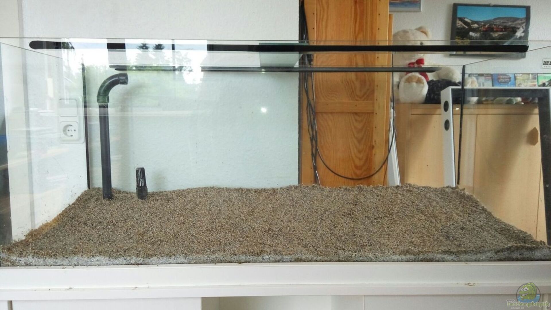 Der Bodengrund besteht aus geschätzen 40kg Naturkies. Der Kies hat eine Körnung von 1-2mm. Der Kies steigt nach hinten hin an, um etwas mehr Tiefenwirkung zu erreichen, wenn man das Becken von weiter oben betrachtet. Mal sehen ob sich der Kies auf dieser Steigung so hält oder ob er absackt.... Wenn er dies tut, werde ich mir nochmal etwas überlegen, wie man ihn festigen kann oder lasse es eventuell auch dann einfach so wie es dann ist :D