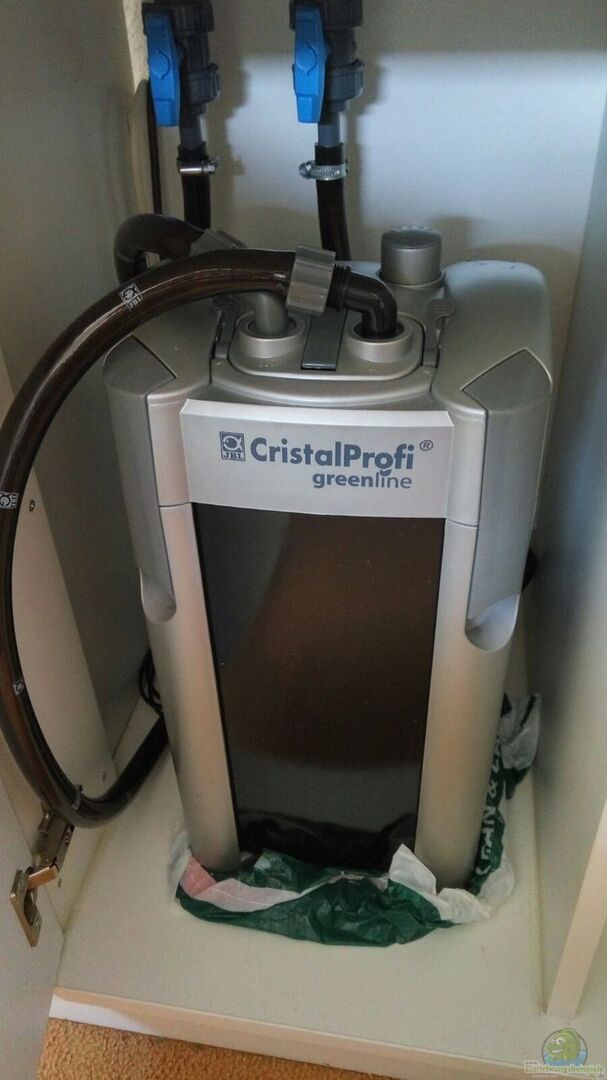 Der Filter ist ein JBL Cristal Profi e1501 greenline. Er hat eine Pumpenleistung von 1400 Litern die Stunde und ein Filtervolumen von 12 Litern. Das ganze wird gefiltert durch 4 Filterkörbe. Die Schläuche zum Ansaugen und zum Ablassen verlaufen direkt durch die Bohrung hinten links im Aquarium zum Filter hin/weg. Um den Filter reiningen zu können sind au??erdem zwei verschlie??bare Ventile angebracht.