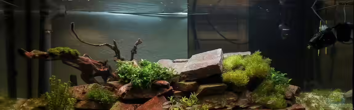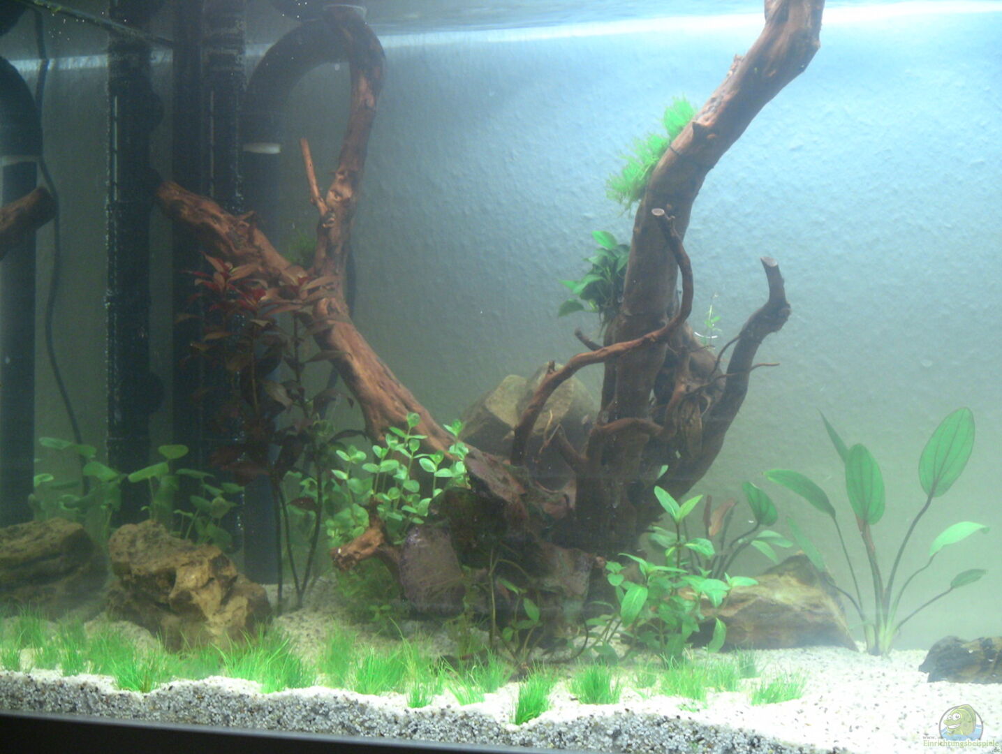 Auf der rechten Seite zwei Mangrovenwurzeln mit aufgebundener Anubias und aufgebundenem Fissidens. Auf der linken Seite eine Moorkienwurzel mit Taxiphyllum und ebenfalls einer Anubias. Au??erdem noch eine etwas hellere Mangrovenwurzel mit Fissidens (aus dem altem Aqua) und Taxiphyllum im Vordergrund. Dazu noch Drachengestein und schwarze Steine in der Mitte aus dem Garten.