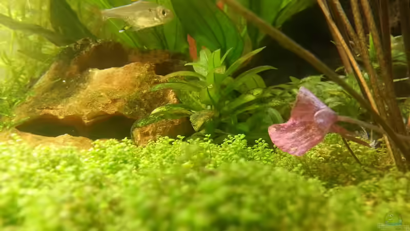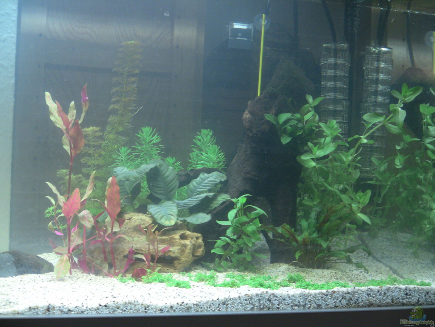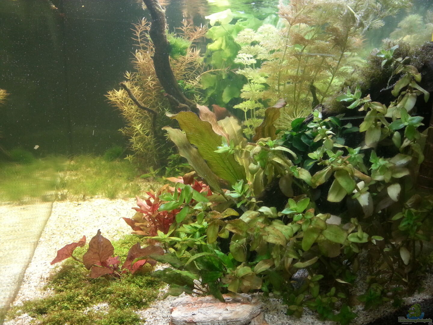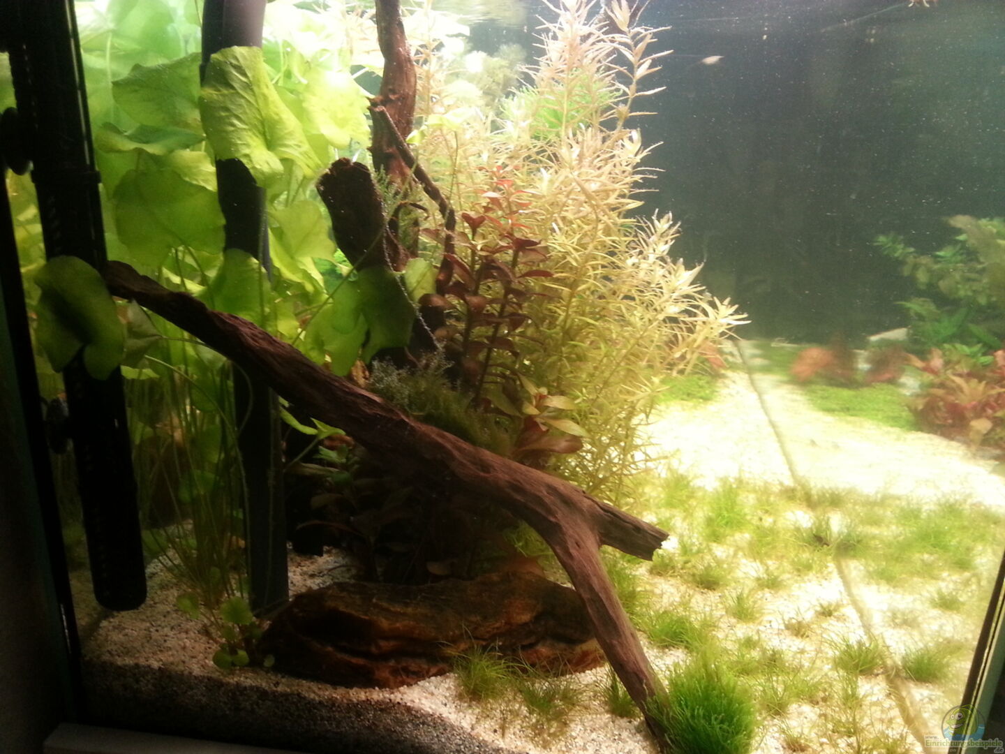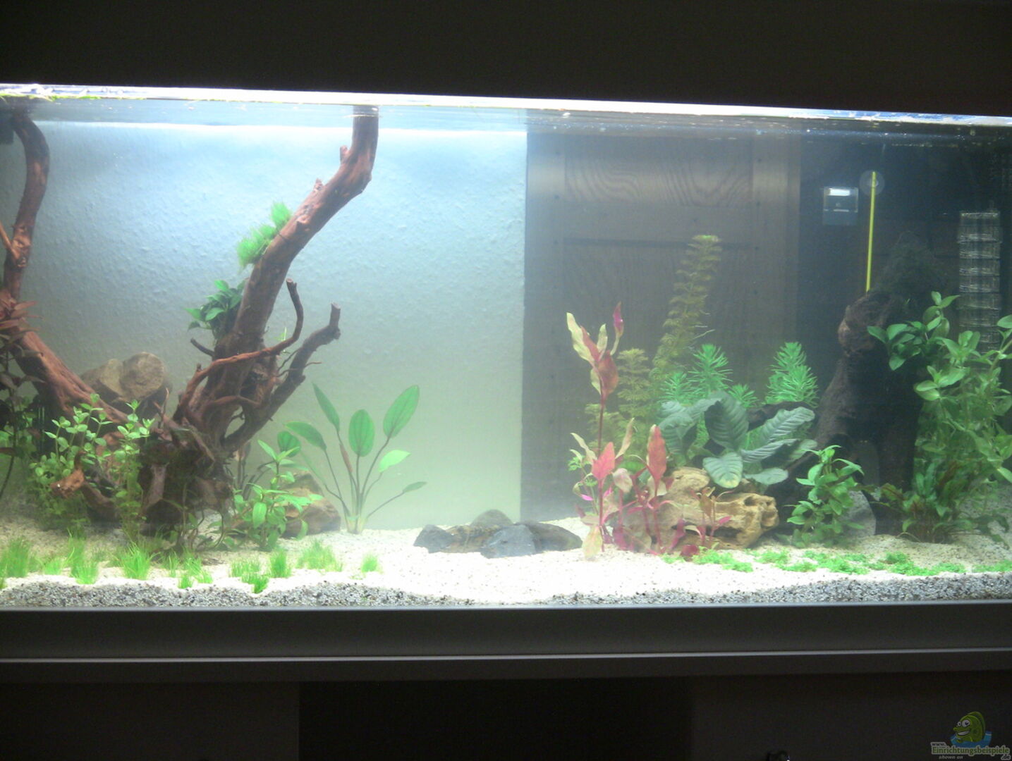 Bei dem Layout habe ich den Schwerpunkt auf zwei Seiten mit einer Art "Bucht in der Mitte gesetzt", also auf eine U-Form. Die Moorkien -und Mangrovenwurzeln sind jeweils mit verschiedensten Pflanzen auf der linken und rechten Seite des Aquariums verteilt. Umgeben sind die jeweiligen Abschnitte auch noch von zwei Drachensteinen. Durch diese beiden Abschnitte entsteht eine räumliche Wirkung und es entsteht auch noch jede Menge Schwimmraum für die Fische. Au??erdem sieht es auch einfach Klasse aus. Bei der U-Form gibt es zu beachten, dass die beiden Abschnitte nicht symetrisch sind; bestenfalls eine ???? Aufteilung vorliegt. Die schwarzen Steine in der Mitte mit aufgebundenem Weeping Moos sind zur Verstärkung des ??? Effekts, wobei bei mir dieser Effekt nicht so stark ausgeprägt ist.