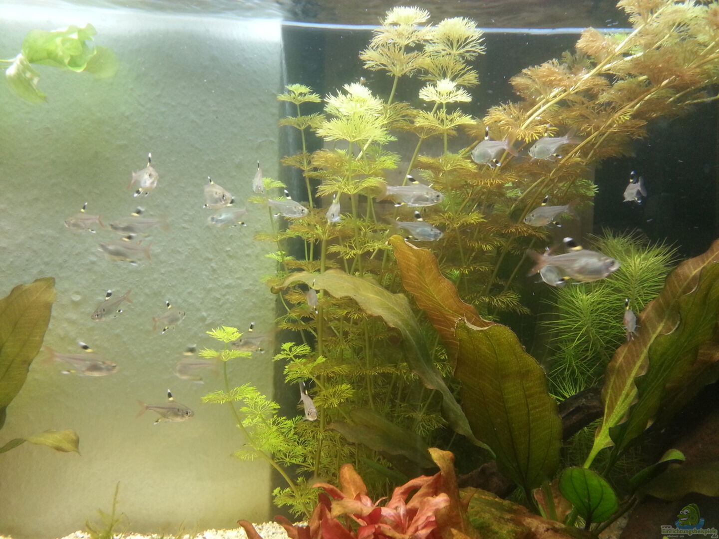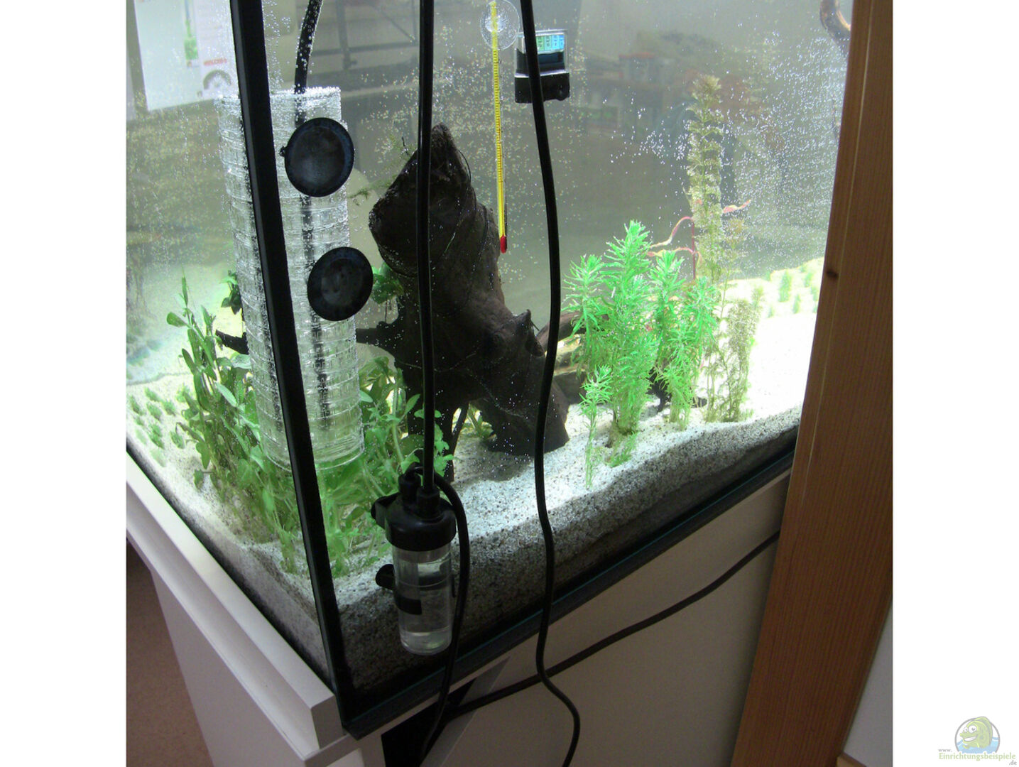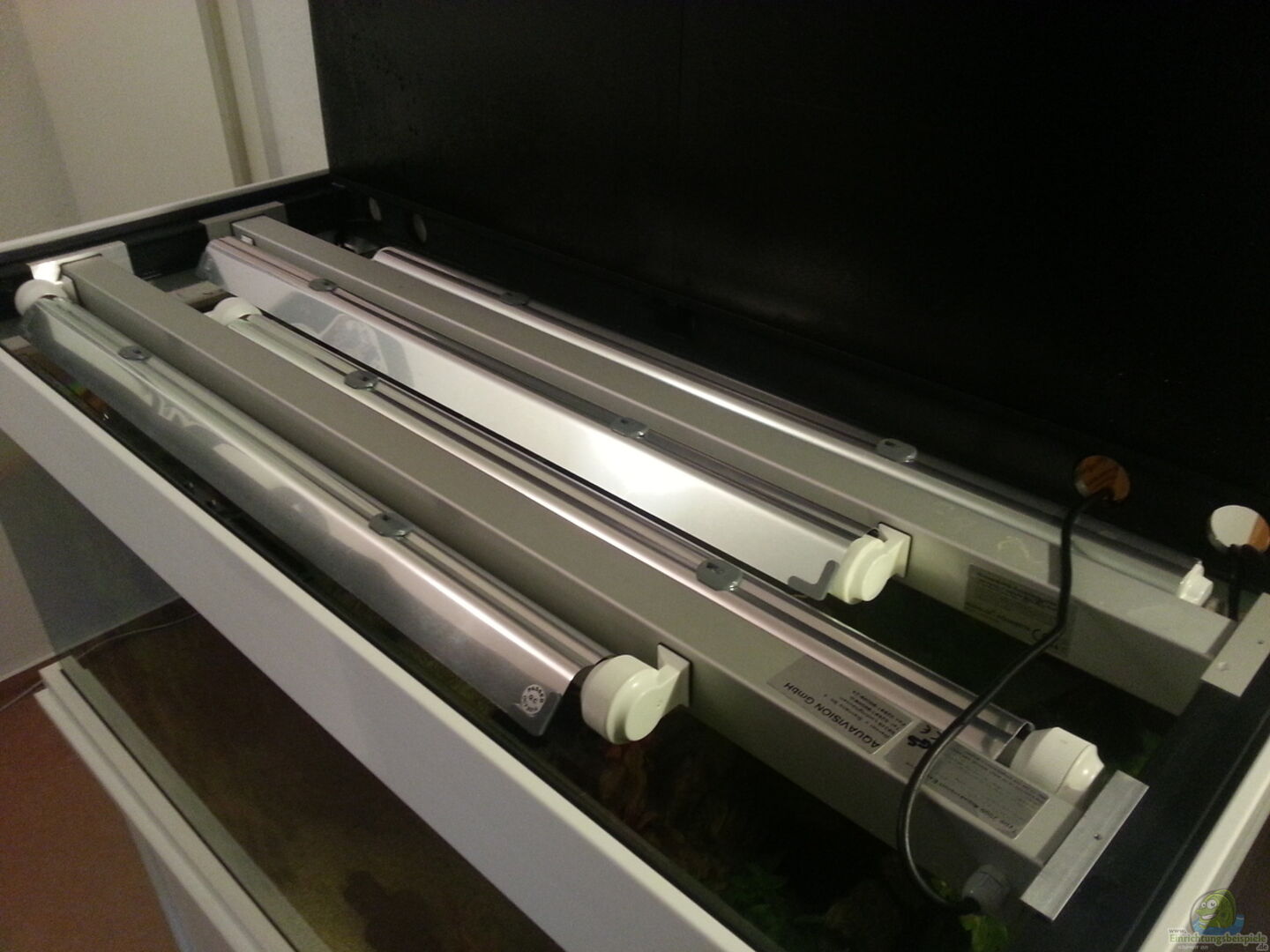 Das Aquarium hat eine Zweilochbohrung für den Au??enfilter in der Ecke links hinten des Aquariums. Dadurch müssen die Schläuche nicht au??en um das Aquarium herum gelegt werden. Au??erdem verfügt das Aquarium über verschiebbare Leuchtstoffröhren. Die Leuchtstoffröhren sind an einer Halterung befestigt, die an einer Schiene läuft. Das erleichtert die Arbeit am Aqua ungemein und so kann man flexibel Lampen tauschen oder aufstocken.